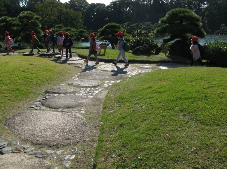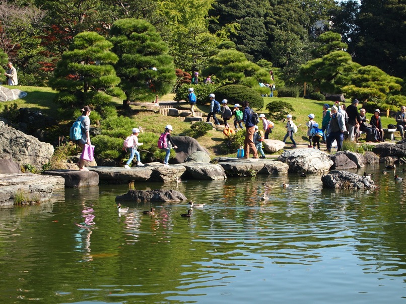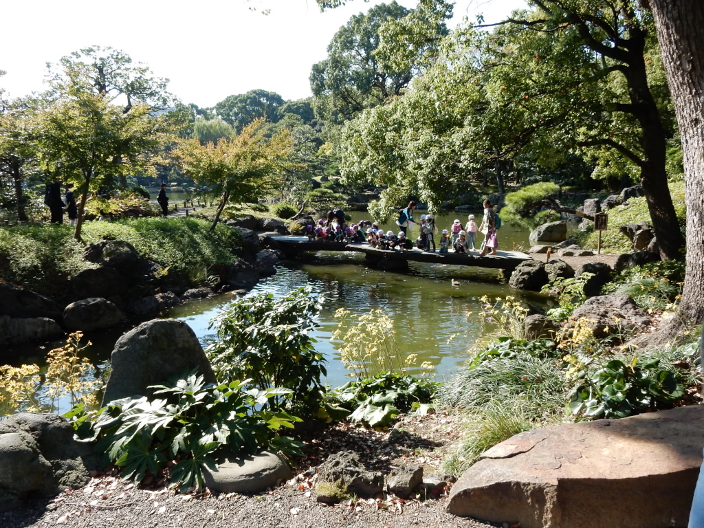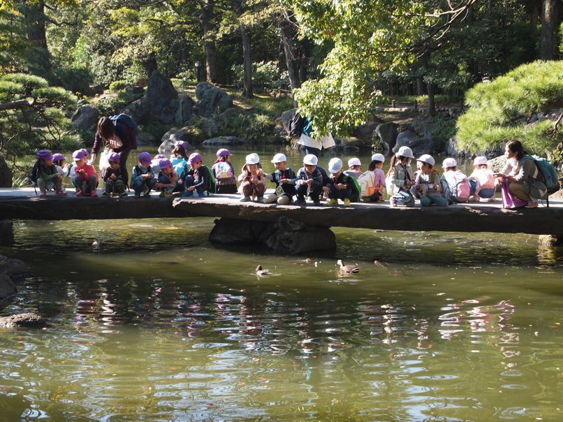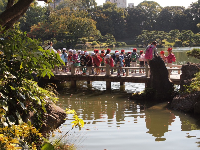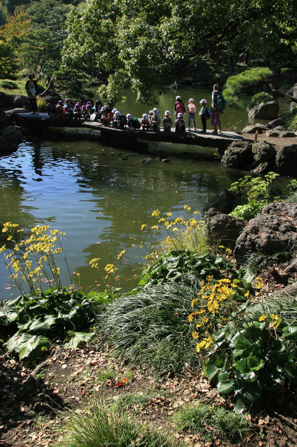 【02】私たちのすぐ前に入園した遠足の幼稚園児たち。お行儀よく橋の上に並んでいます。池の鯉を見ているのね。