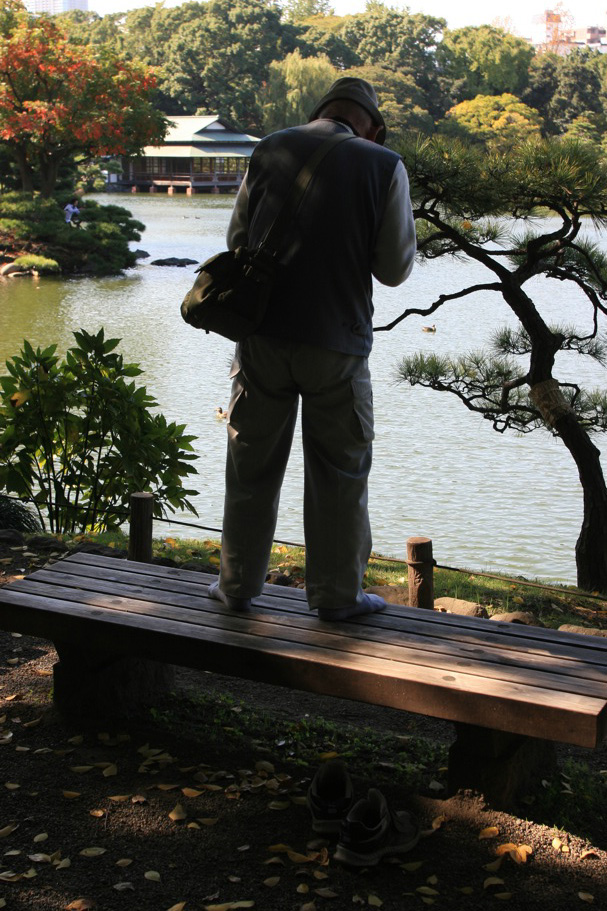 【03】靴を脱いで、ベンチに立って、カメラを構えて、シャッターを押す。只今、撮った写真のチェック中。まさか、そんな自分が撮られているなんて、想像もしていないことでしょう。おじさん見つけて、立ち止まって、カメラを構えて、シャッターを押す。いただきました!
