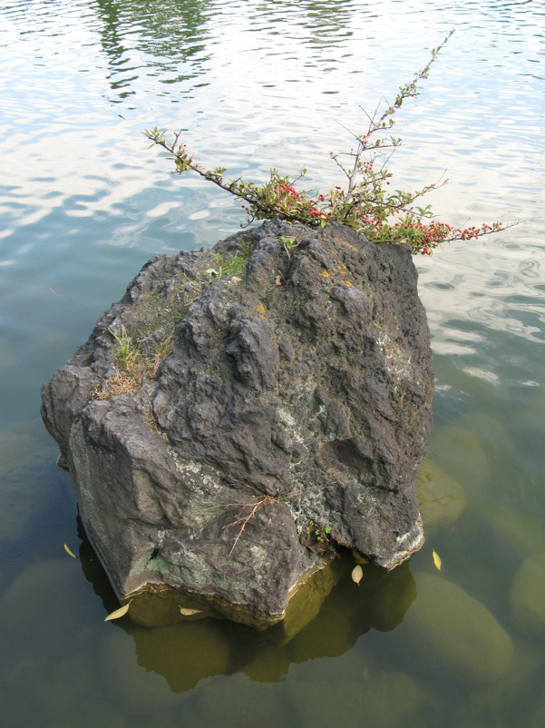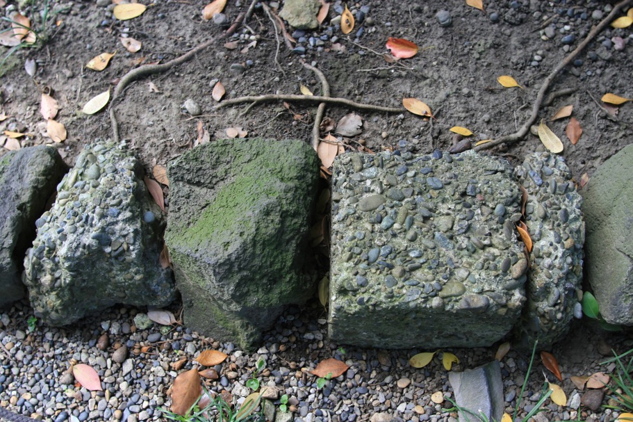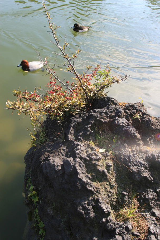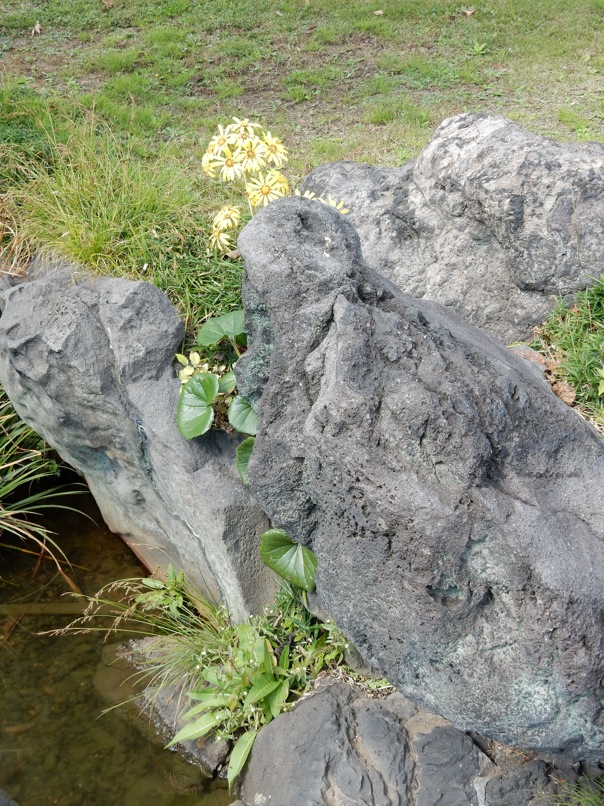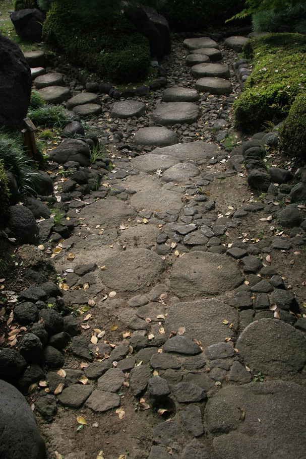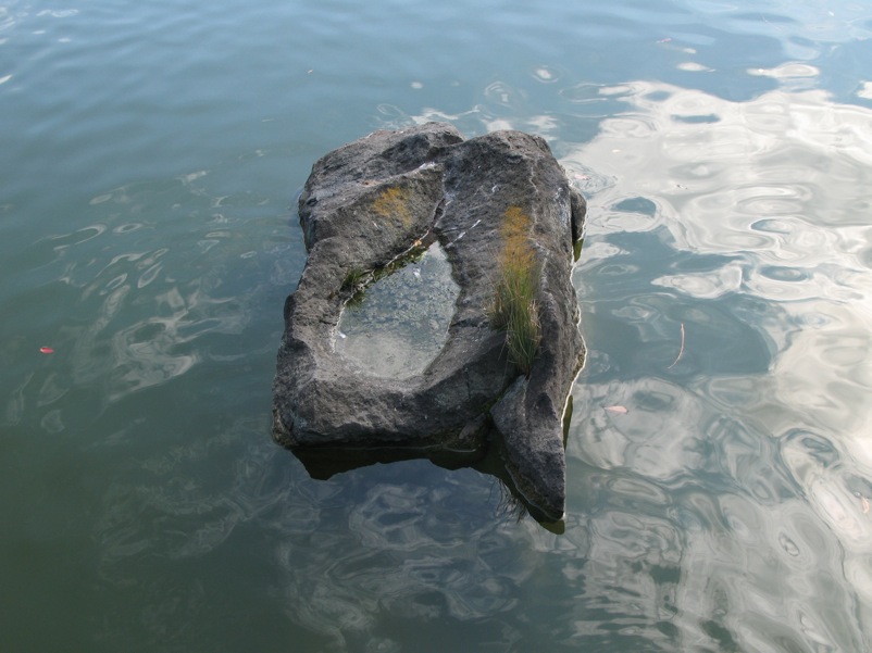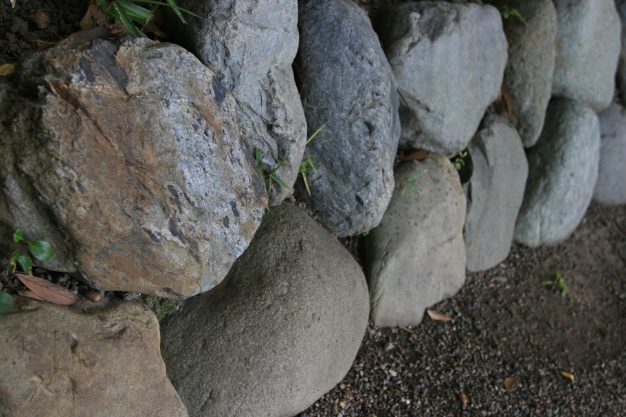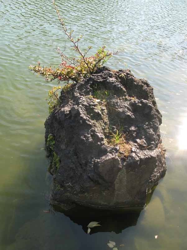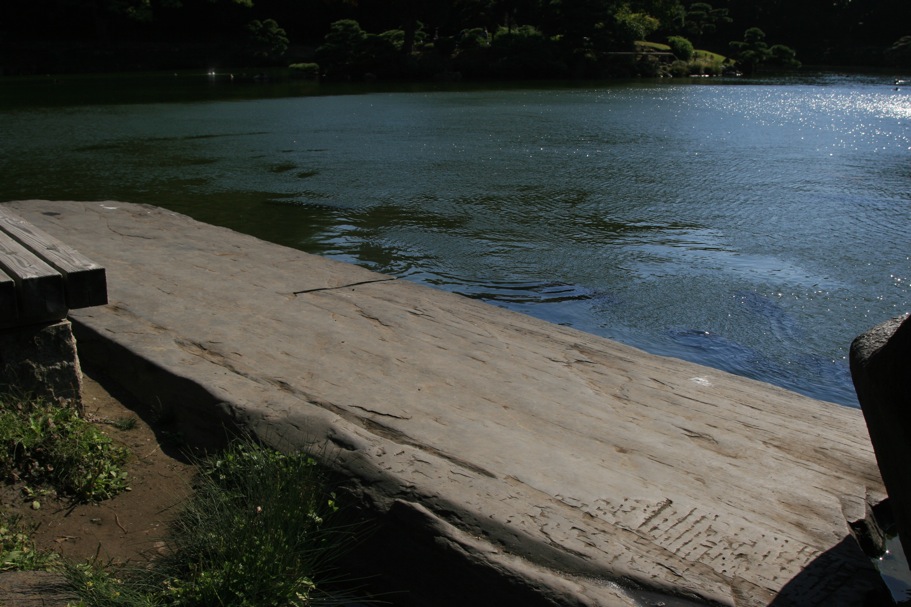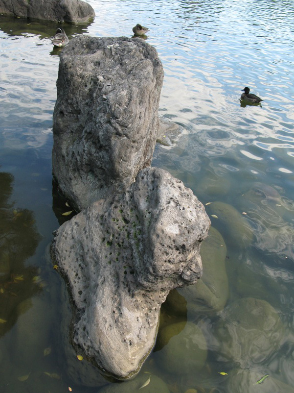 【06】この清澄庭園では、いろいろな所に、実にいろいろな石が使われている。その中でも特に気に入ったのが、この石囲い。灯篭の一部や、柱の一部が使われているみたい。それがなんとも言えずユニークで、なんといってもお洒落!装飾品としての命がまた吹き込まれ、人の目を楽しませ続けるこの石たち。私の目には、幸せそうに映りました。