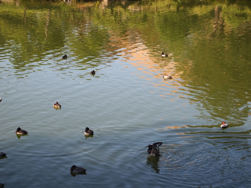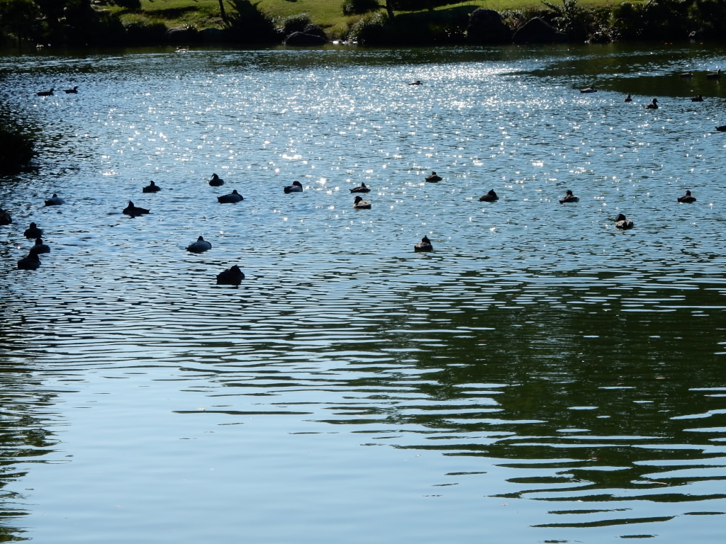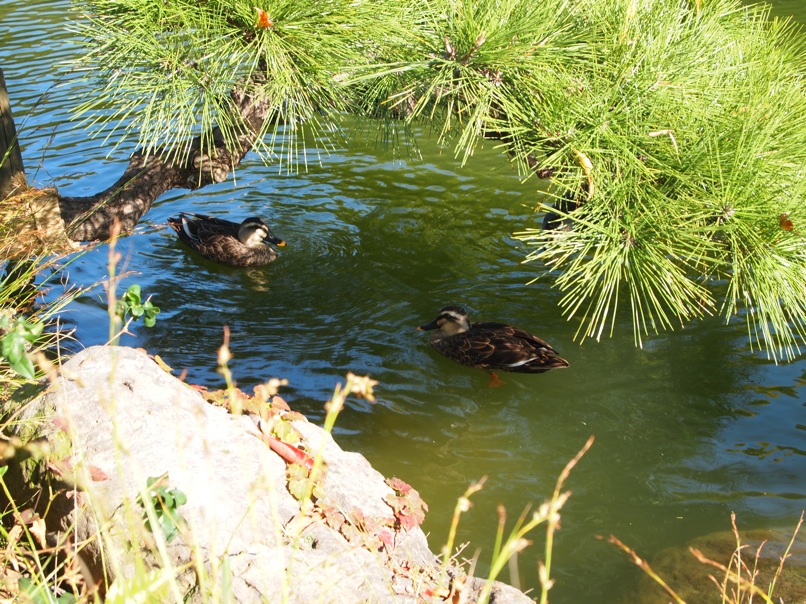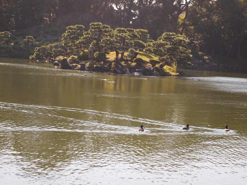 【46】水鳥達が池の中程にお行儀良く並んでいました。もう少し上の方に松の木を見せたほうがバランス的に良かったのかもしれません。