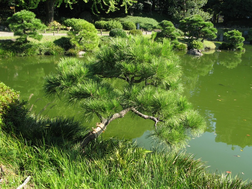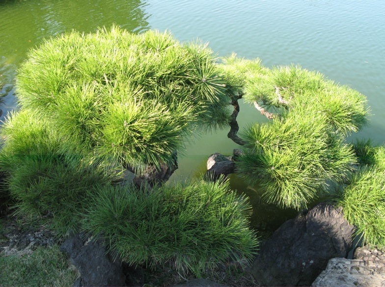 【21】池の中の小島、背の低い松は体育祭、組体操のピラミッドを連想させる配置。左右の緑はカットして撮っても良かったようだ。