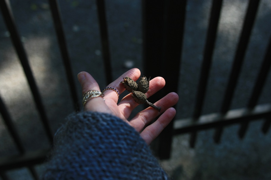 【47】園内の隅の方、足元にたくさんのどんぐりが落ちていました。辺りを見渡すと、大きなどんぐりの樹がそばに立っていて、時折カサッという音を立ててどんぐりを落としていました。帽子をかぶったどんぐりはよく見るけれど、洋服を着たどんぐりは初めてです。2、3枝拾って、友達へのお土産にした。