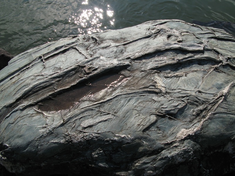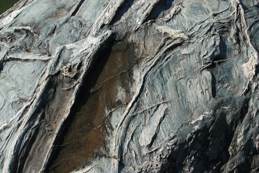 【59】何ものかによって削り削られ、まるで宇宙から見た惑星のような表面。この写真をじっと眺めながら、この表面に近づいていく景色を想像する。筋のように走っている線は山脈、水の溜っているくぼみは大きな湖。ここからは見えていない所には、きっと生物がいて、植物が生えようとしているに違いない。・・・地球もそうか。なーんだ、おんなじだ。