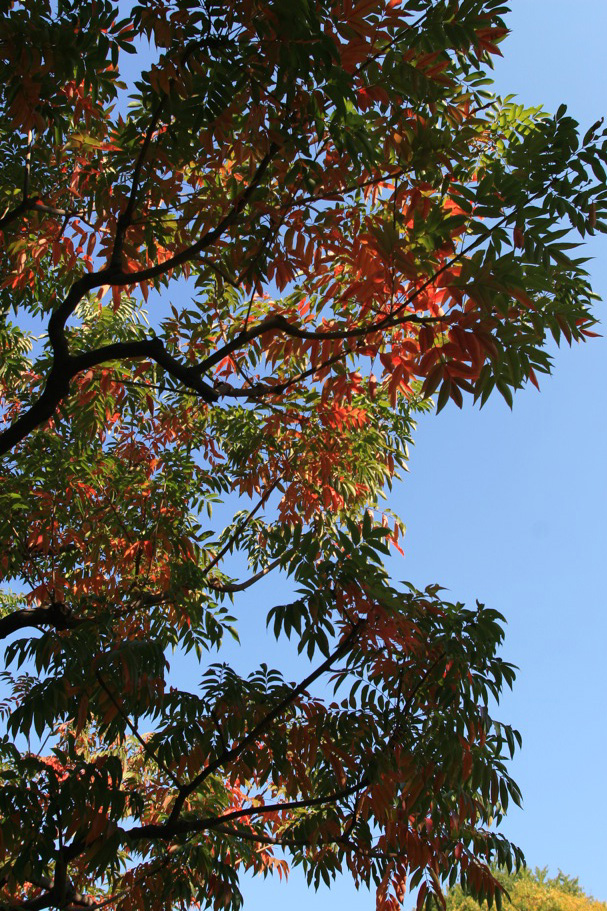 【64】少しづつ色づきだした葉っぱ。一面が色づいた景色も素敵だけど、こうやって緑も黄色も楽しめる時期だってすてきです。この日は特に、空の色が穏やかな水色で、日の光がいっぱいで、植物が生き生きとして見える一日でした。
