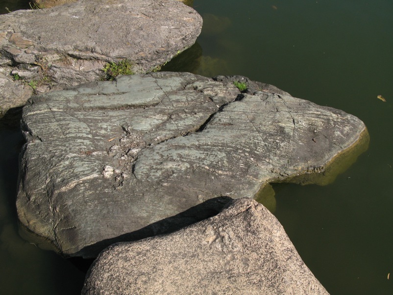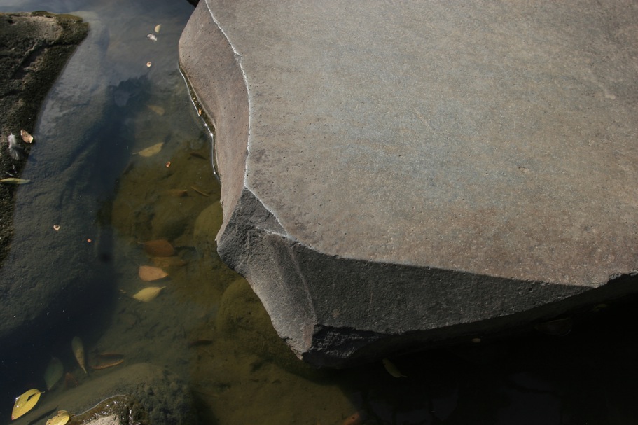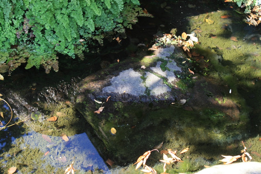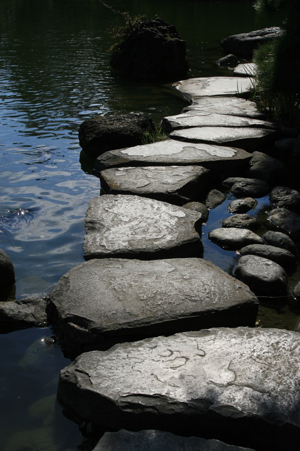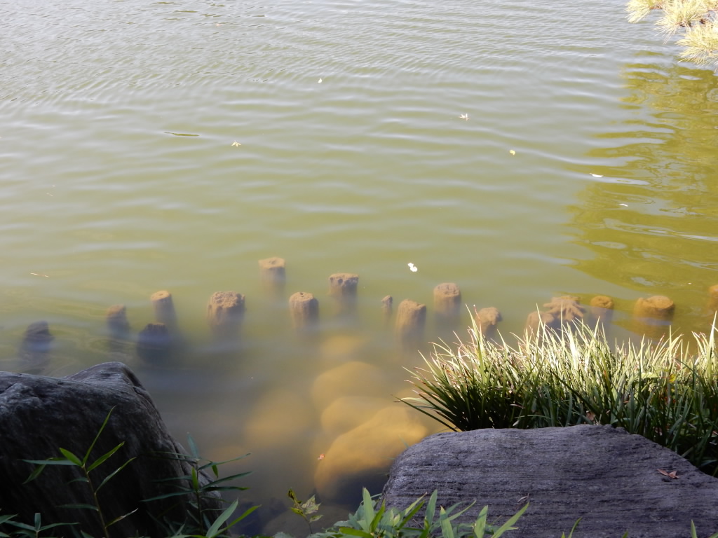 【77】水面に浮かぶ飛び石。日が当たっているのかいないのか、不思議な光の中の写真。この水面の揺れに合わせて、石もゆらゆらと動き出しそうな気配。