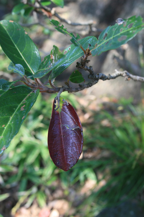 【81】虫に食われながらも一生懸命に色づいた葉。踏ん張って踏ん張って、気が付いたら誰よりも早く赤くなっていました。