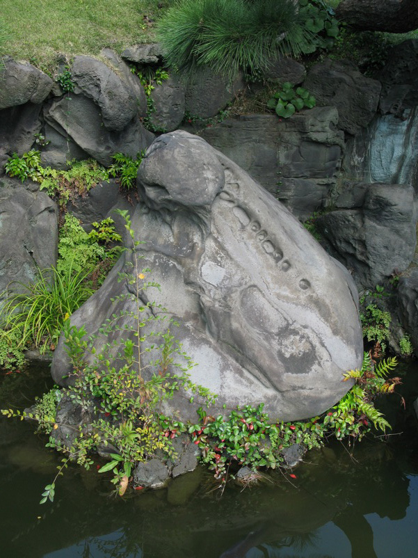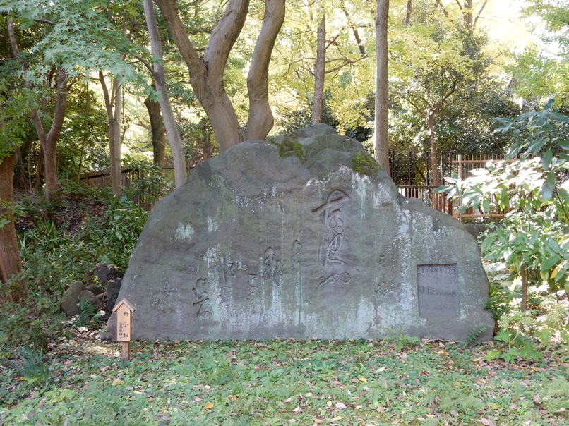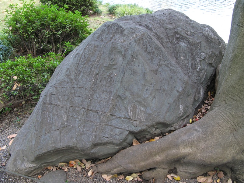 芭蕉の「古池や」の名句が刻まれた石です。芭蕉の奥の細道行始発点がこの近所にあるとの事で、商魂たくましい庭園側が設置を考えたのでしょうか。後ろの大きな木に負けない位堂々とした石でした。