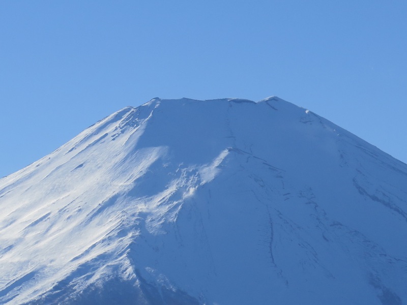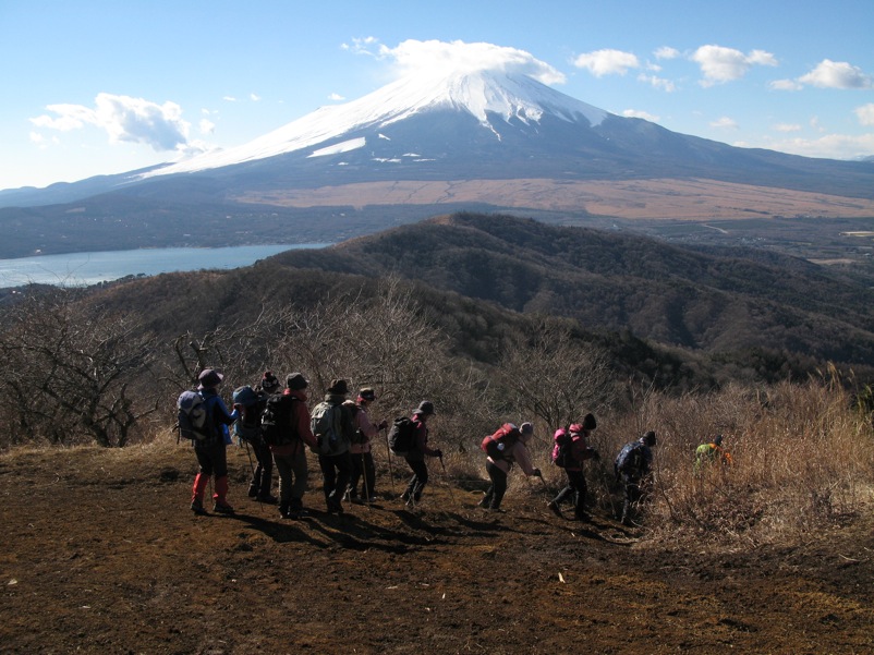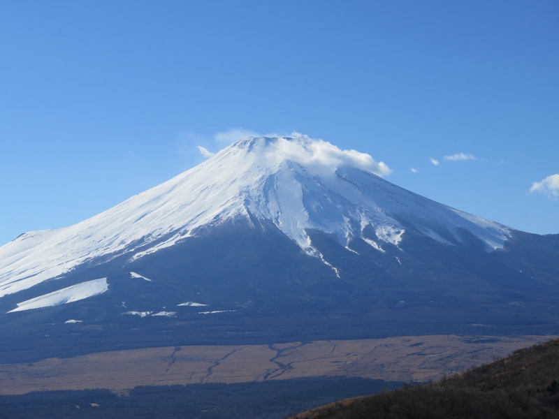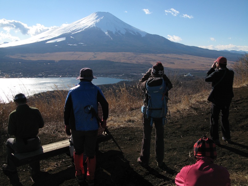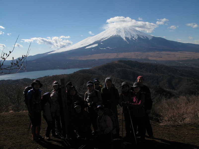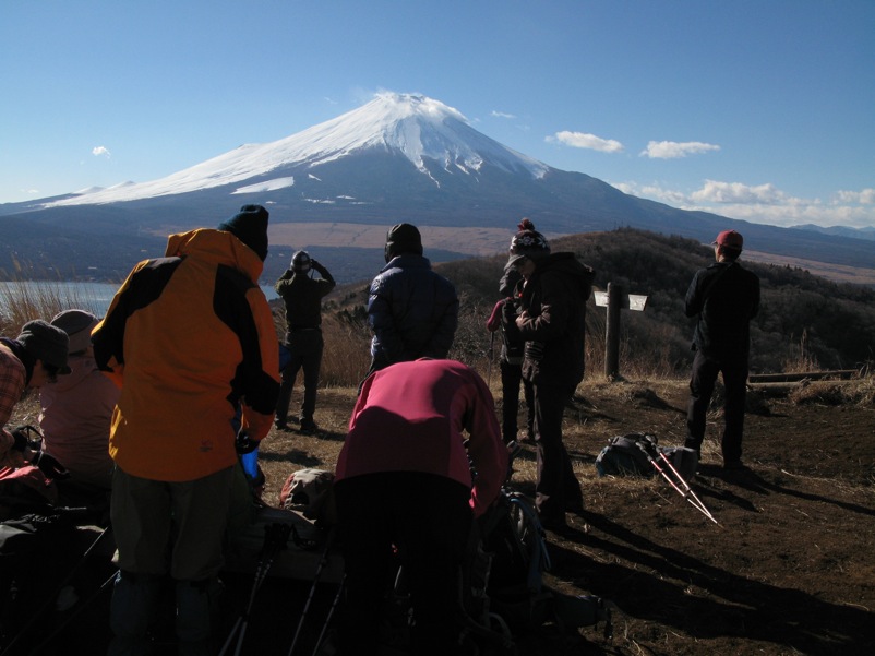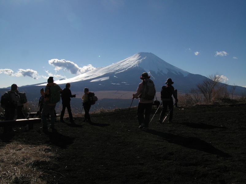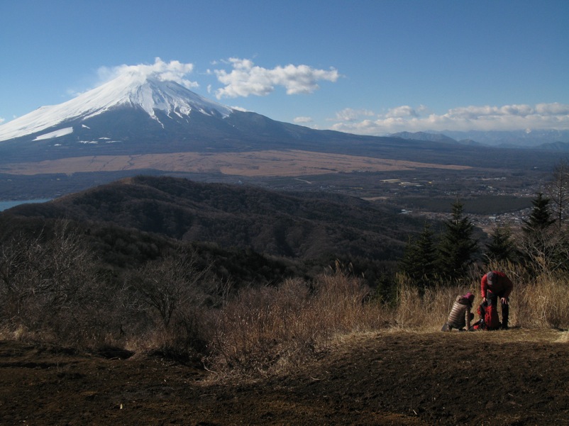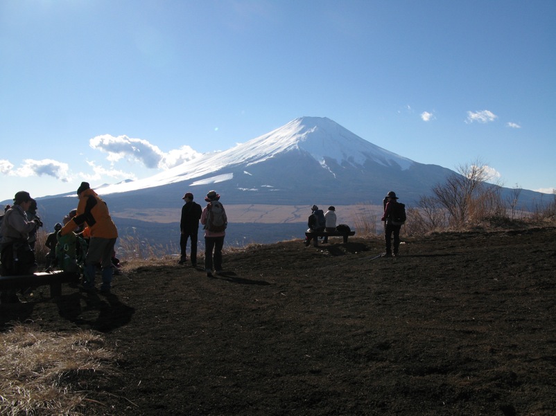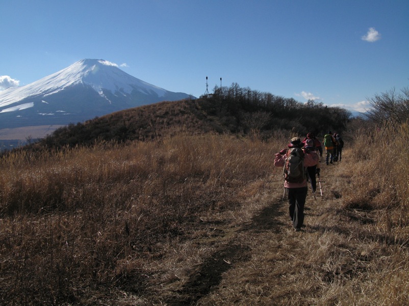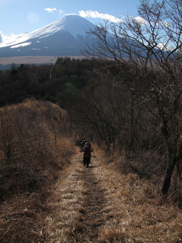 展望がいいのに風があまり強くないので「10分休憩」としました。糸の会では「10分休憩」は「一口食べる休憩」ですから、場所を選びます。凛とした冬の富士山を真正面に眺めながら、凍えずに休める気持ちいい休憩を10分ちょっと楽しんで、出発です。最後尾の私は最後にもう一枚富士山を撮っておきました。