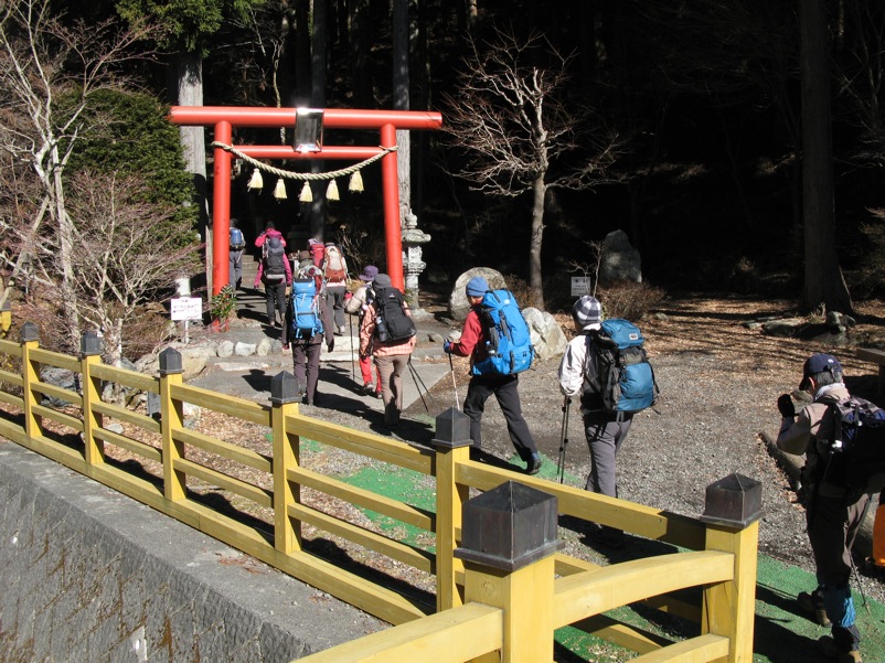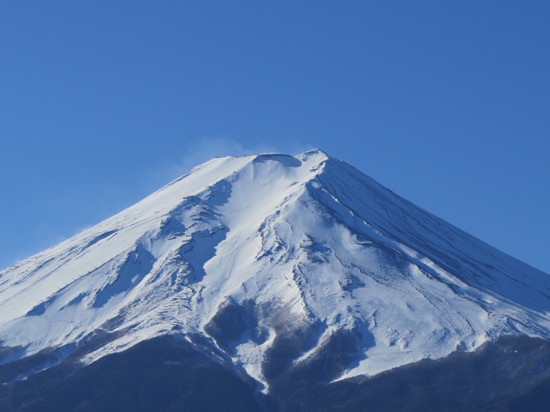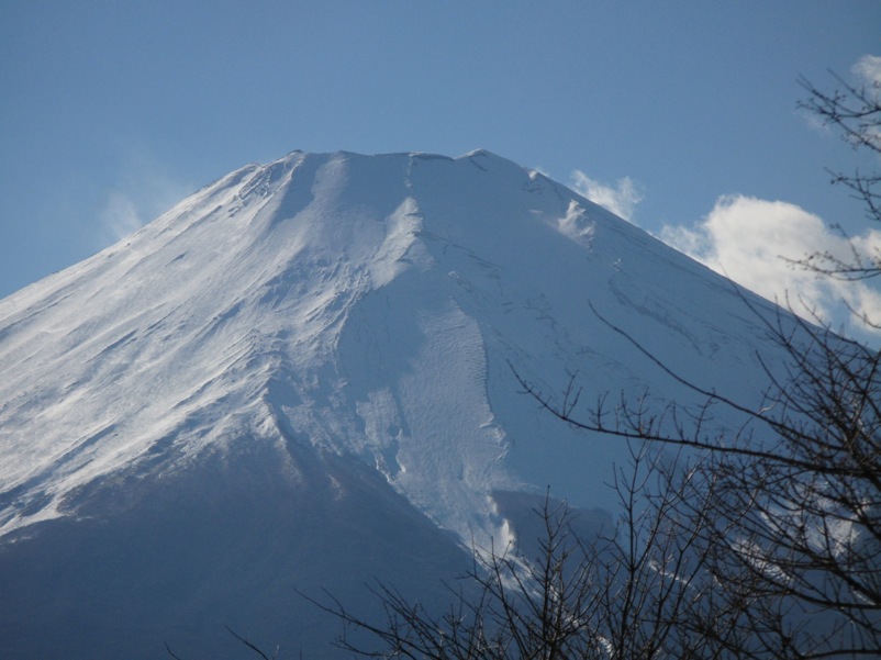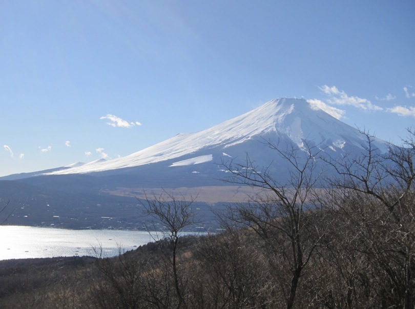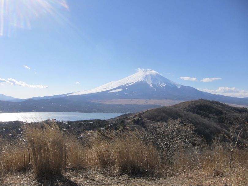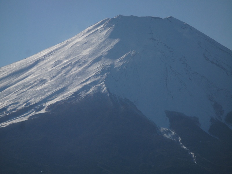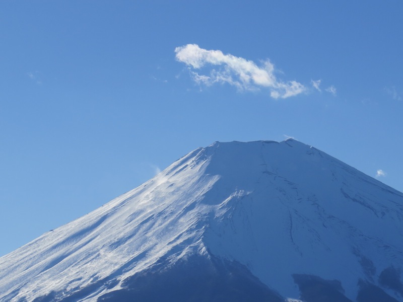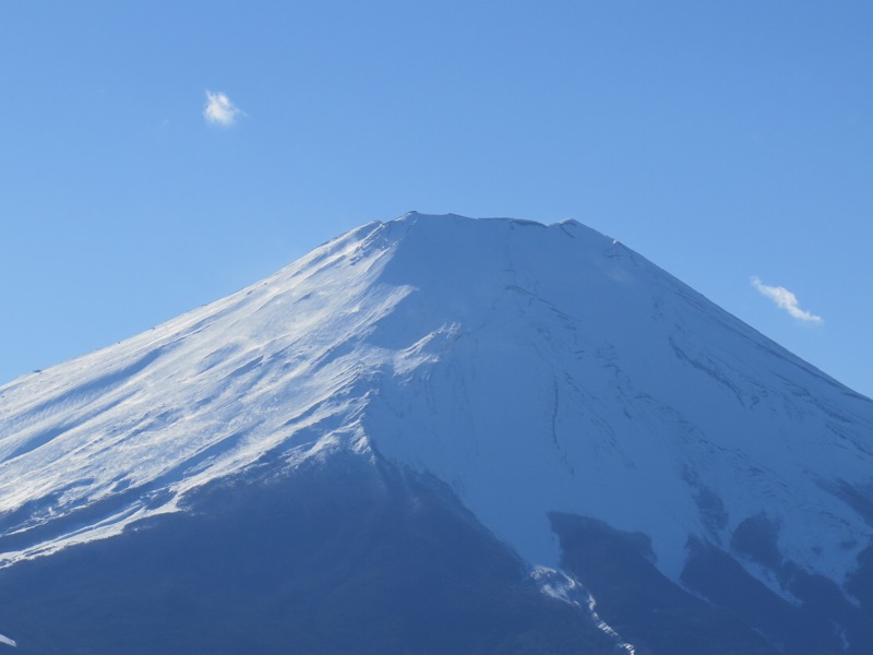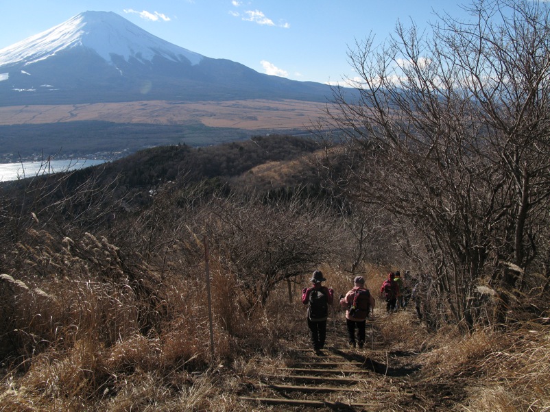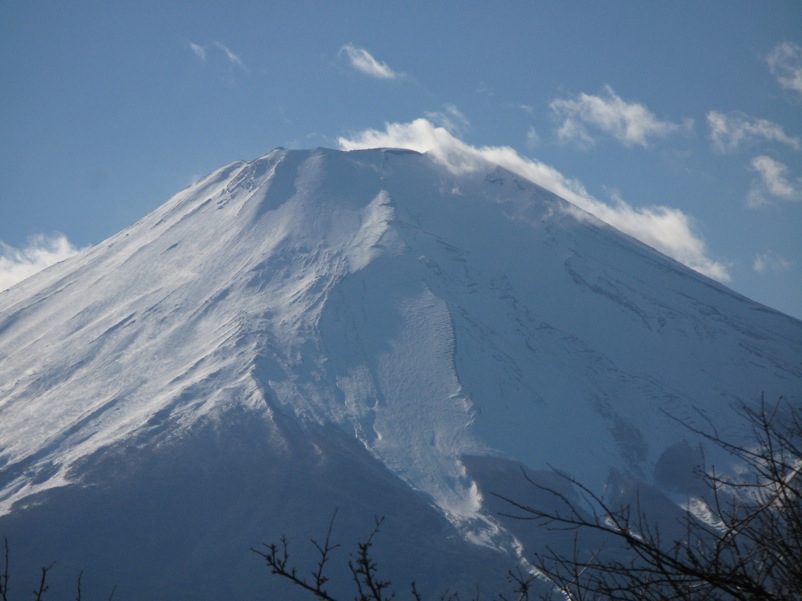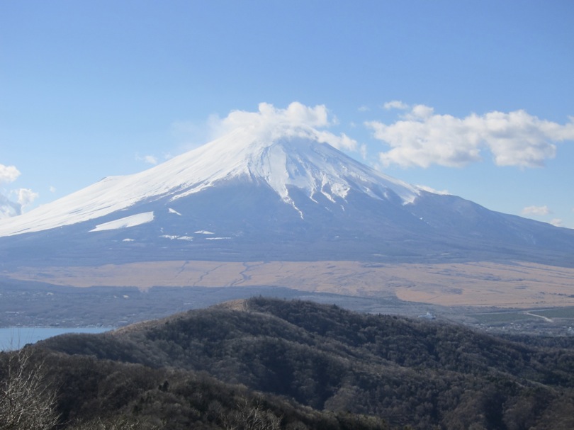 展望がいいのに風があまり強くないので「10分休憩」としました。糸の会では「10分休憩」は「一口食べる休憩」ですから、場所を選びます。凛とした冬の富士山を真正面に眺めながら、凍えずに休める気持ちいい休憩を10分ちょっと楽しんで、出発です。最後尾の私は最後にもう一枚富士山を撮っておきました。
