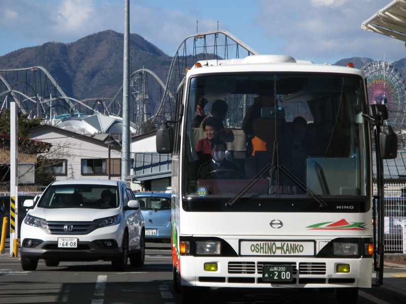 山中湖村と忍野村は平成の大合併でそれぞれ隣り合った「村」のまま残りました。……ということは平たくいえばお互いに金持ち村。山中湖の湖岸にはたくさんの別荘があります。そして忍野には忍野八海、ではなくて工作用ロボットの世界的メーカー・ファナックがあります。このバスには忍野観光と書かれていますが、私の感覚では忍野タクシーがもつマイクロバス。きれいです。ファナック御用達のタクシーも黒塗りのセダンです。急遽登場してもらって、特急あずさの遅れを取り戻すことができました。