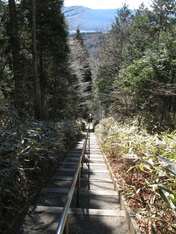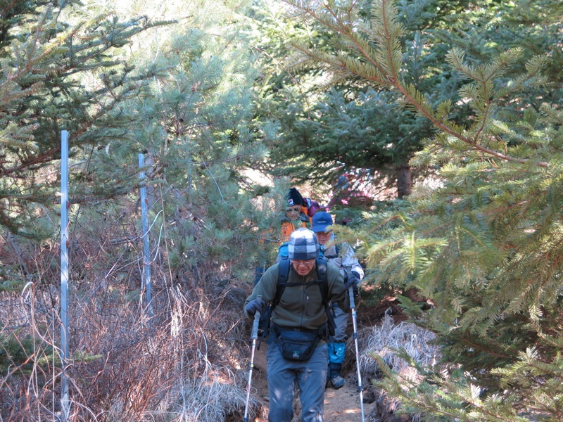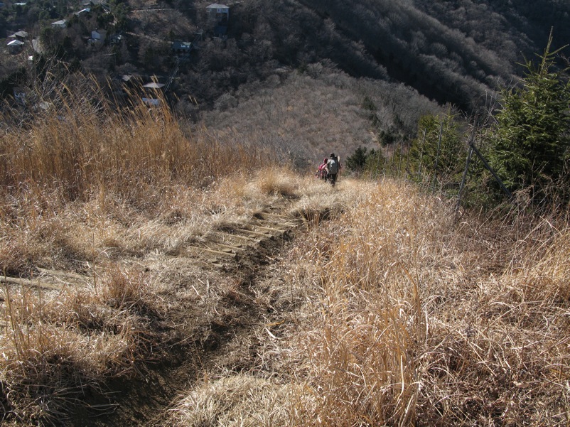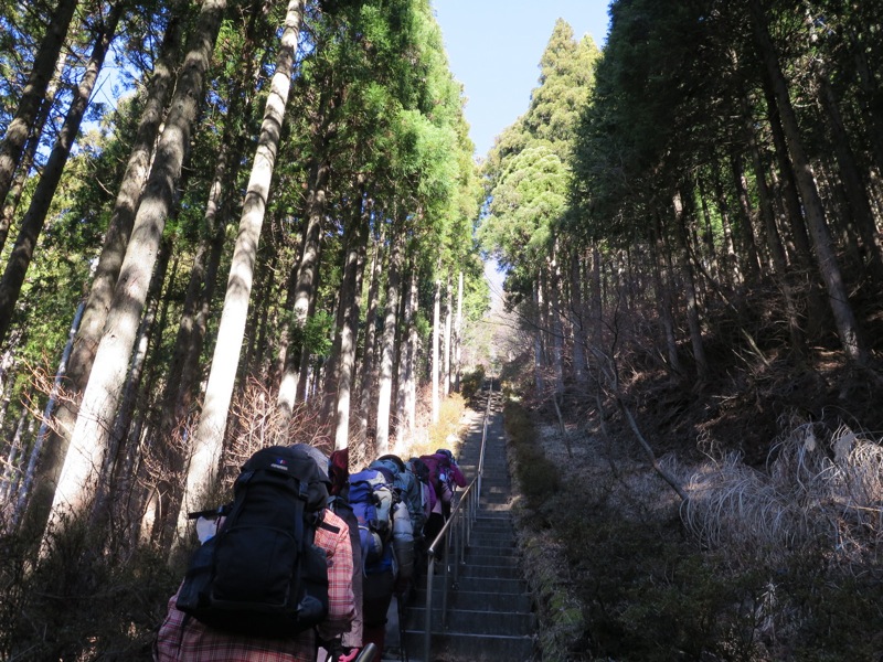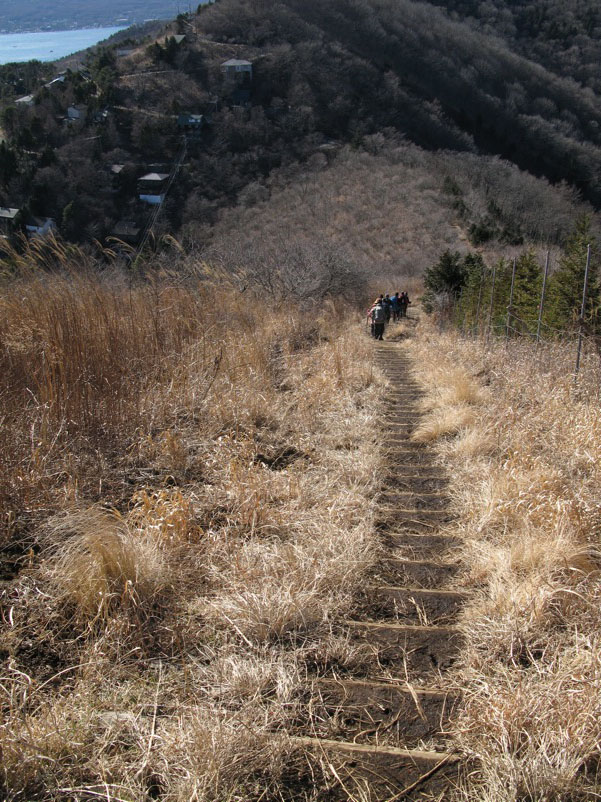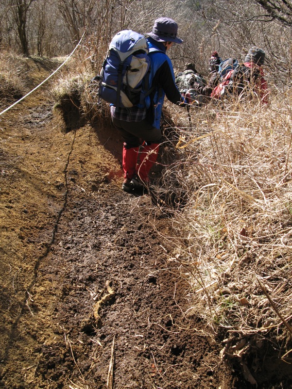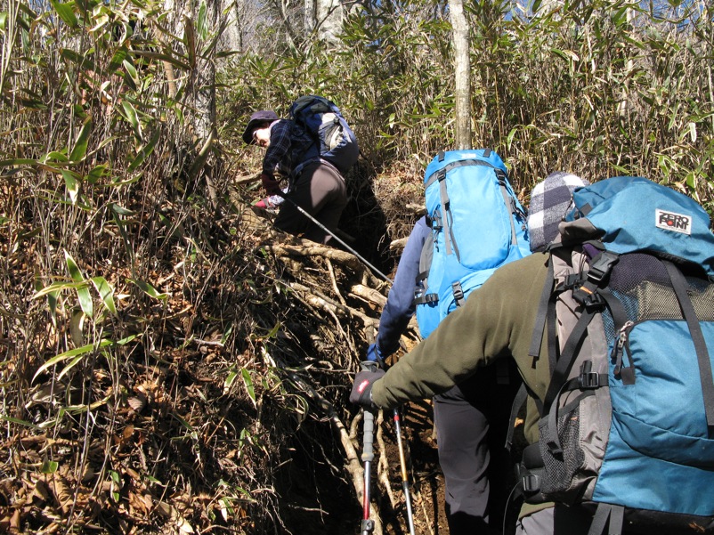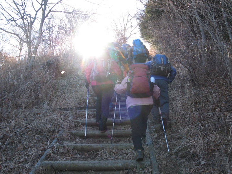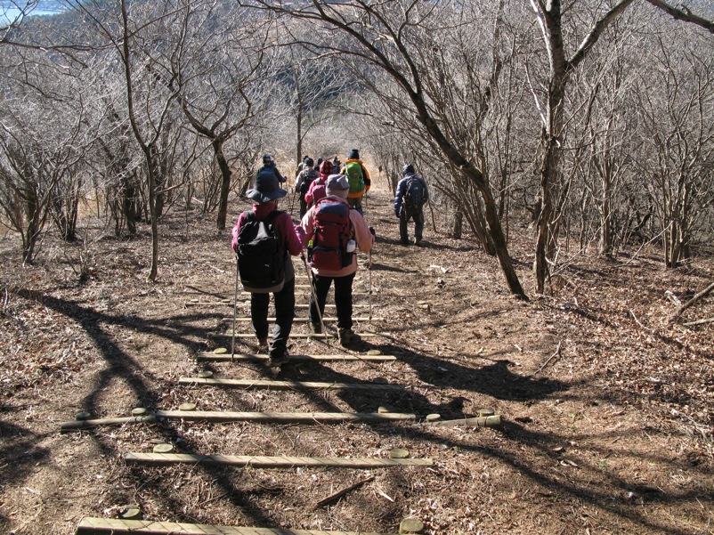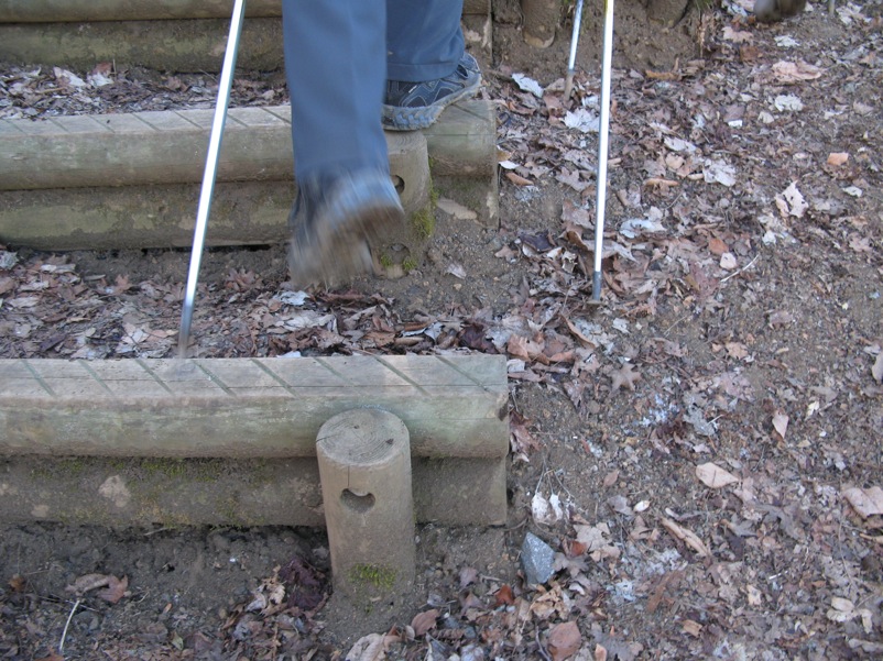 土留めの階段はほとんどのひとが嫌いますが、左手に別荘地と接しているこの階段の土留めは間隔が狭いので、ほとんど全員が杭のてっぺんを踏んで歩くことができました。