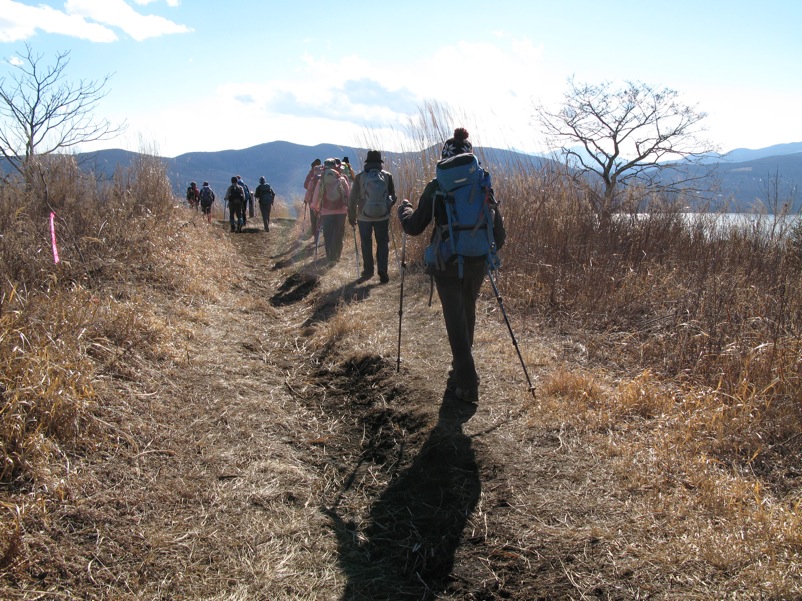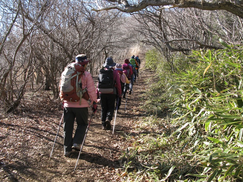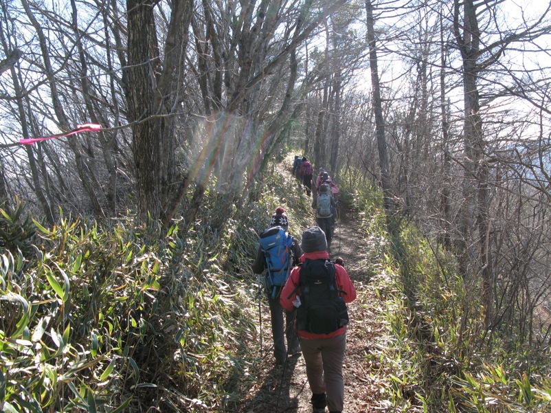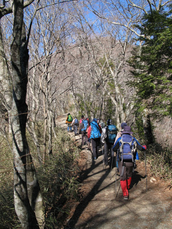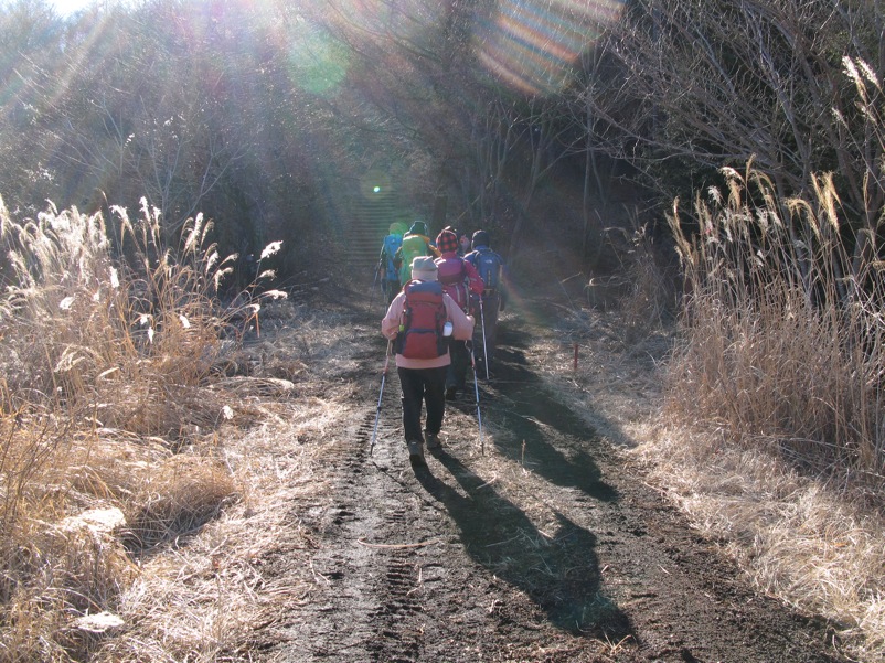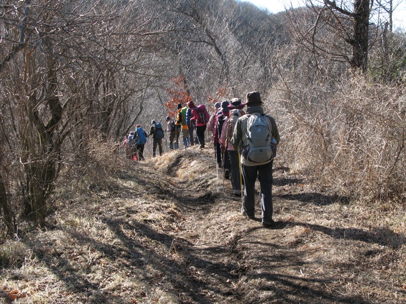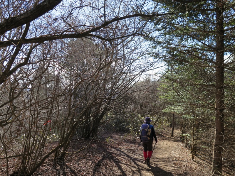 真冬の午後の日射しはドラマチックです。北風がビュンビュン吹いている日でも、稜線と鞍部以外ではけっこう無風がふつうです。ときには半袖シャツ1枚になりたいほどのポッカポカ。「日だまりハイク」はそういう隠れた心地良さを含めた言葉です。もちろん冬に葉を落とす広葉樹林、すなわち自然林の山道の話ですが。