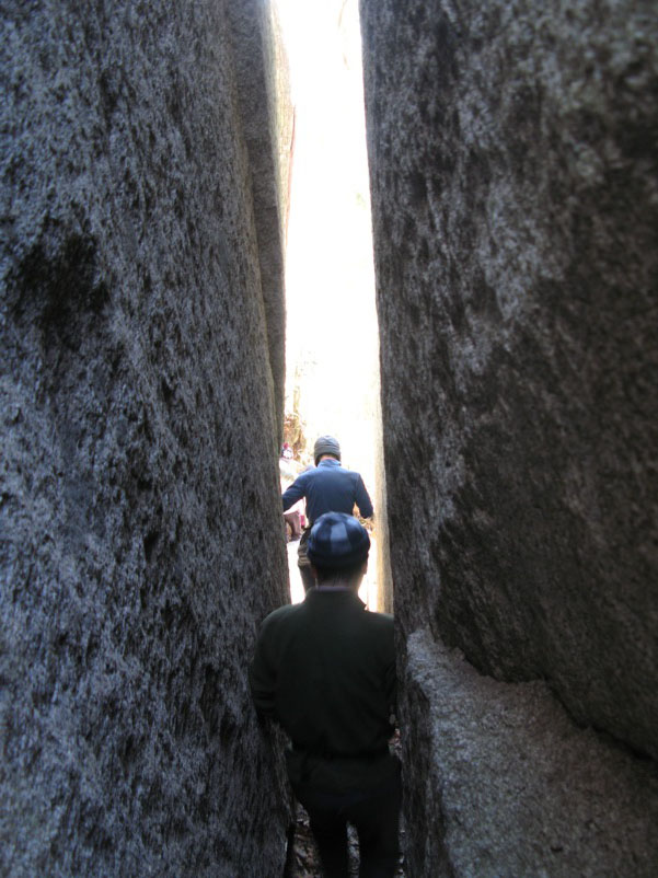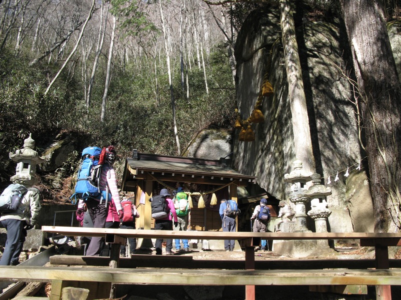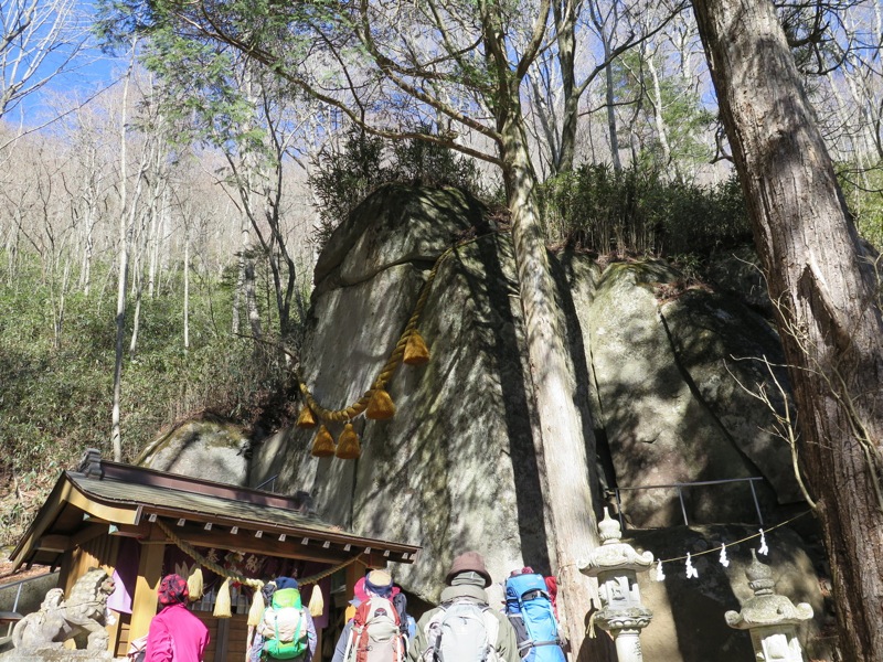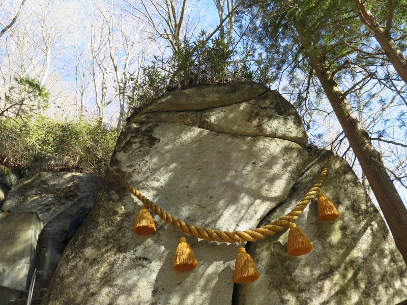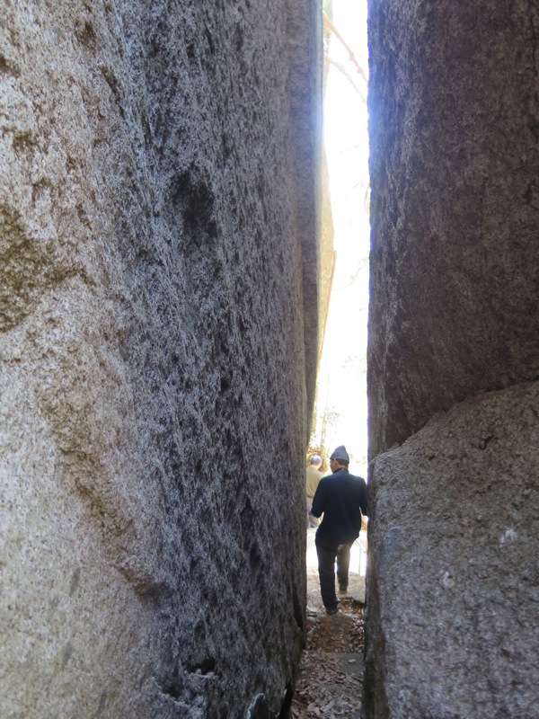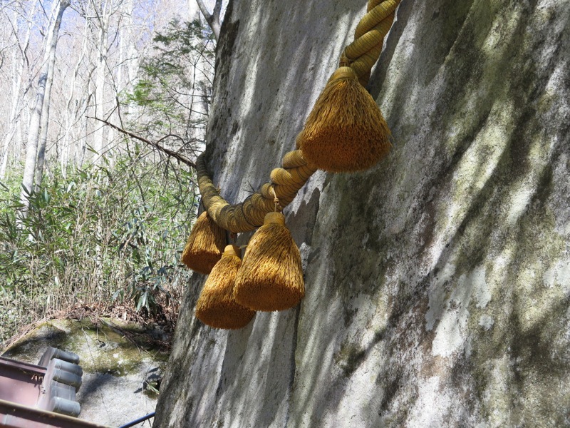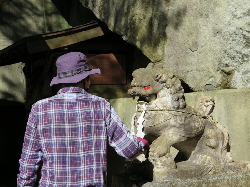 大きな岩が、これだけきれいに割れると、やっぱり神秘的ですよね。しかもこのあたりではここでしか目にしない巨石が、たまたまか、こんなふうに、絶妙に割れ目をつくってくれていた。ちょうど、じつは私なのですが、左側に視線を向けていいるのですが、かつてそこには冷水がしみ出していました。不老長寿や、病気平癒などに御利益があったかもしれません。いまは保健所がうるさくなったので、出さなくなったのかもしれませんが。