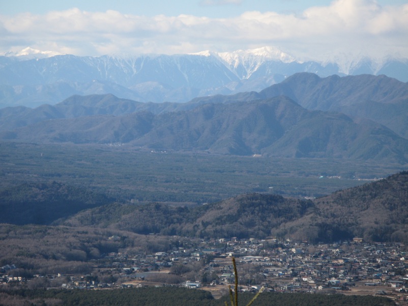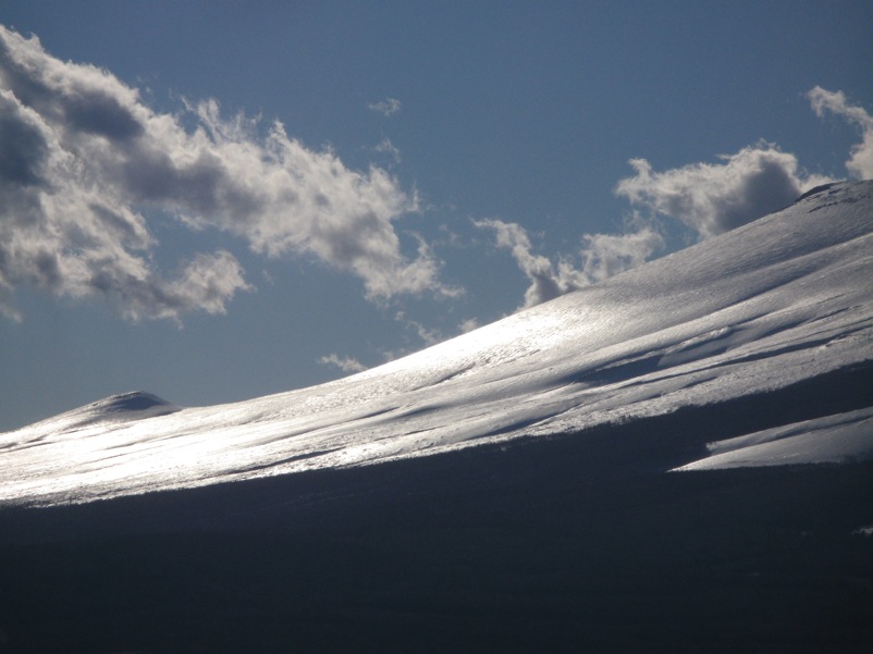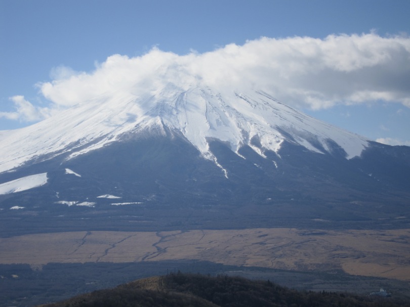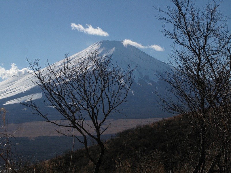 富士山に向かって下っていくと、右側の足元が忍野村です。青木ヶ原の向こうに盛り上がっているのが足和田山、その陰に西湖があって、御坂山地がそびえています。その一番西側の高まりとして王岳(1,623m)だと思いますが、さらにその向こうに白い山脈がそびえています。そのときには赤石・荒川岳と思ったのですが帰って地図で調べてみると北岳(3,193m)を中心とする白根三山のようです。……とすれば左端に見えている白い山は塩見岳。