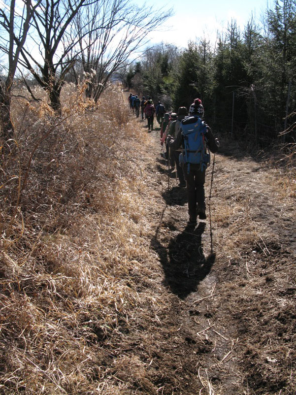最近の「軽い山」ではほとんど、先頭を10分交代にしています。いわゆるリーダー交代制です。私は最後尾について、その前の人が次の10分間トップに立ちます。(通常の交代方法とちょっと違いますが)そうするとトップは自分の気持ちいいペースで歩けますし、ゆっくり歩きたい人も10分後には必ず追いつけるので、無理のない歩き方をできます。全員が自分流に、というわけではありませんが、私がトップでペースメークするときよりは、たいがい速くなります。私は平尾山出発時に南アルプスの写真を撮って、この下りで取り返そうとしています。前方の斜面に別荘群が出てきました。