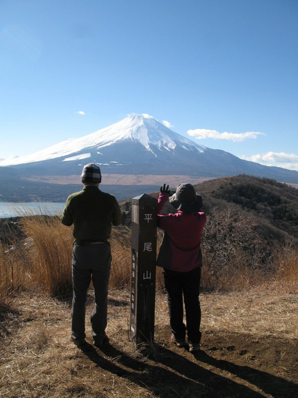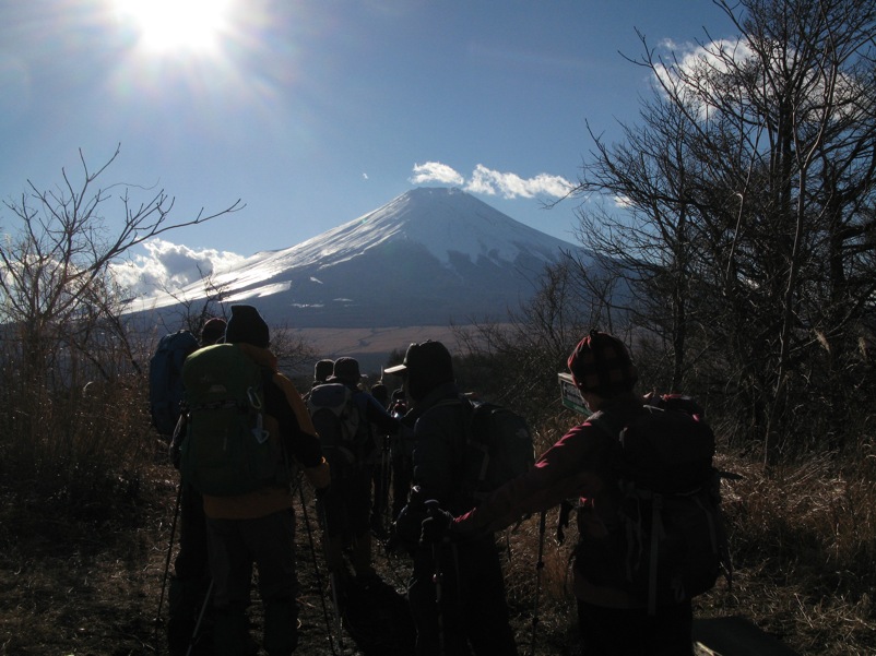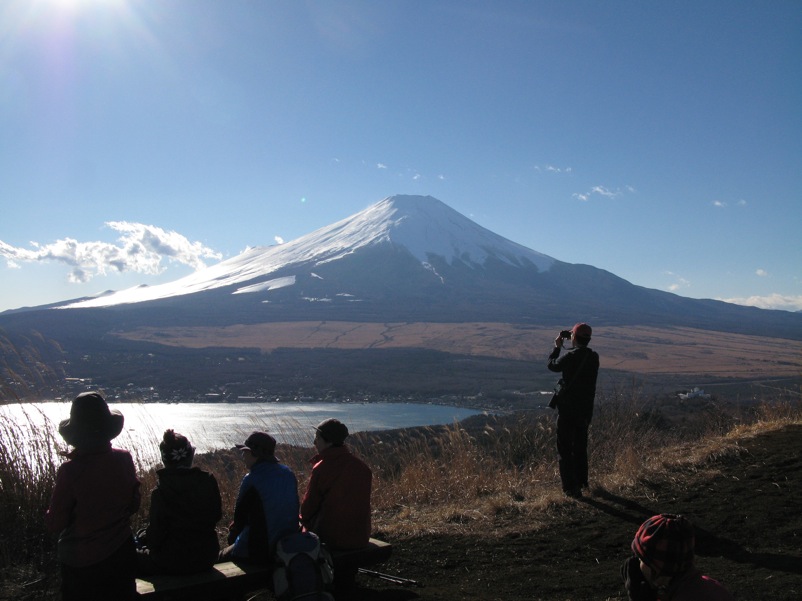 ほぼ逆光の記念撮影です。このフレーミングでオートで撮ると、みなさんの顔はいちおうわかります。しかしせっかくの富士山は白い空に溶け込んでしまっています。