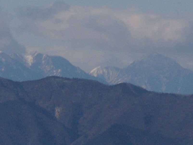 写真【74】からカメラを右に振ると、これは鳳凰三山。一番高く見えるのが観音岳(2,840m)で右側にオベリスクの尖塔を立てた地蔵岳、左の低いピークは薬師岳。手前はたぶん御坂山地・十二ヶ岳の稜線だと思われます。