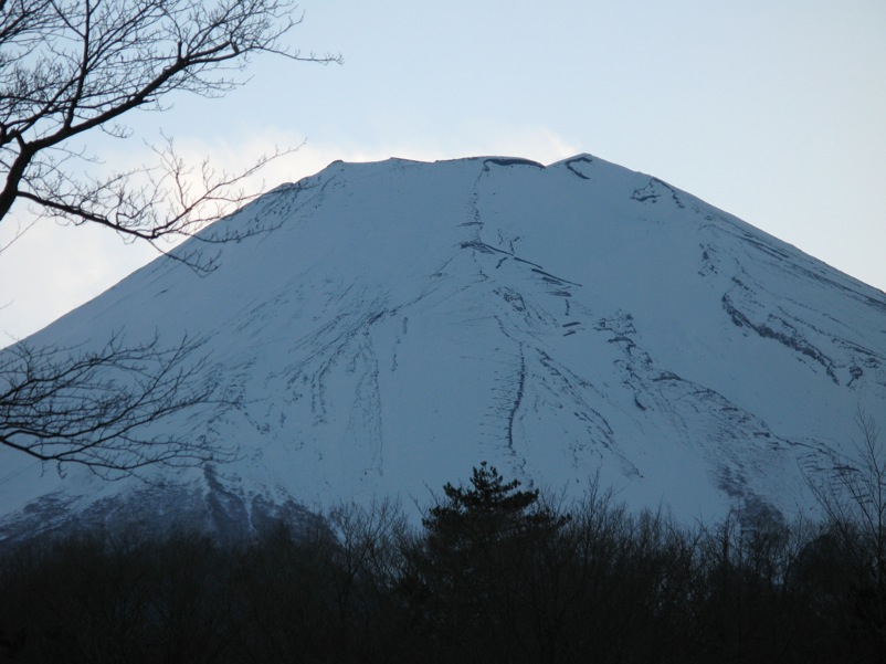 撮影時刻にご注目ください。手前が暗くてよくわかりませんが、紅富士の湯の露天風呂からの富士山です。つまり山中湖畔に着いてから紅富士の湯に来るまでの間に太陽は富士山に落ちたようです。湖畔ですこし待ってもよかったかな、と反省しました。(じつは湖岸のどこかでハクチョウたちが群れていると期待していたのです。そうだったら必然的に落日を見られたはずなのですが)