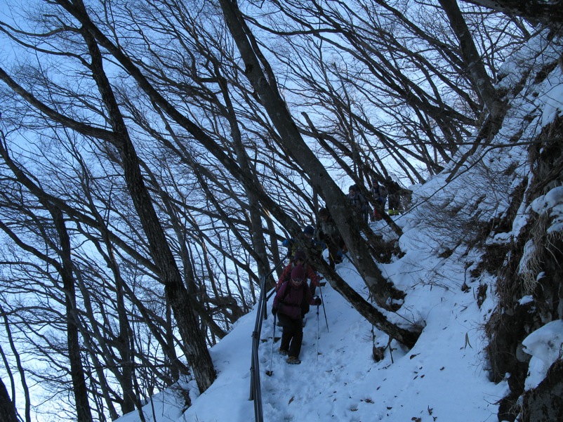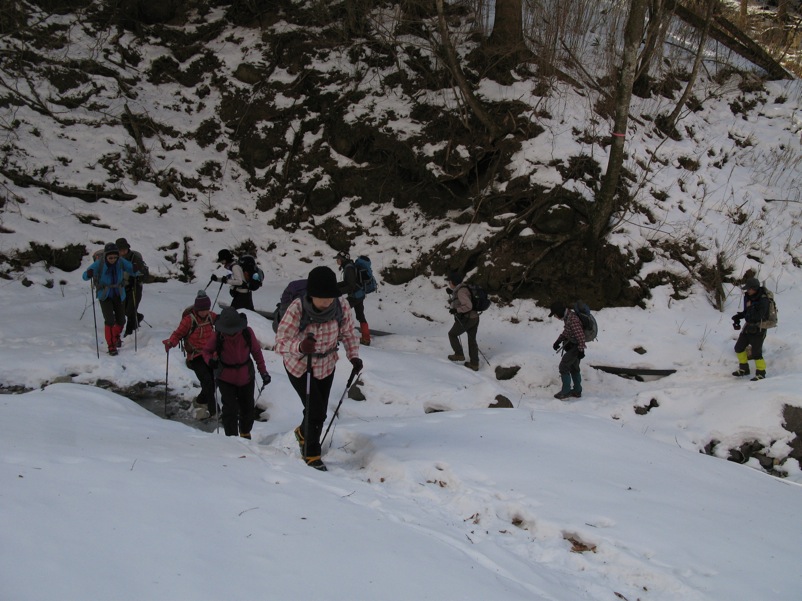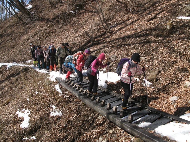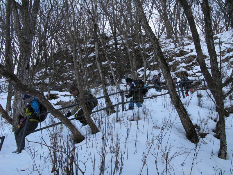 この写真の4人目の人がこの橋を渡りきれない状態になりました。アイゼンをはずせば、もちろんOKなのですが、その人以降の皆さんには山側の斜面を歩いてもらいことにしました。何の問題もない故に。