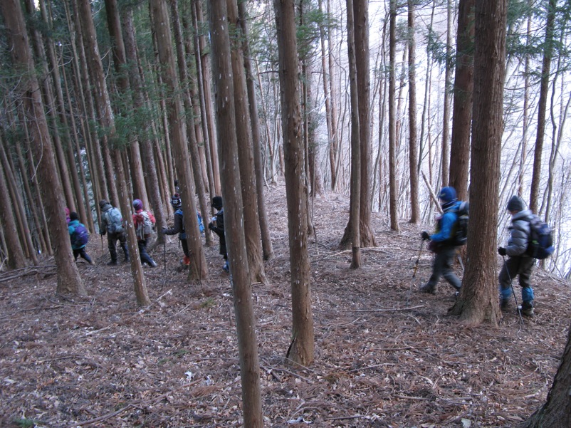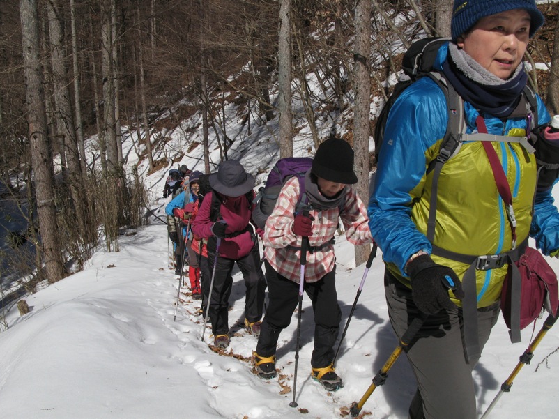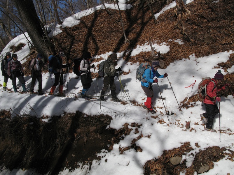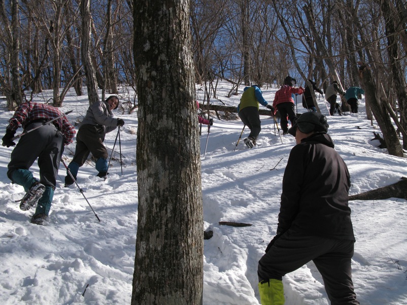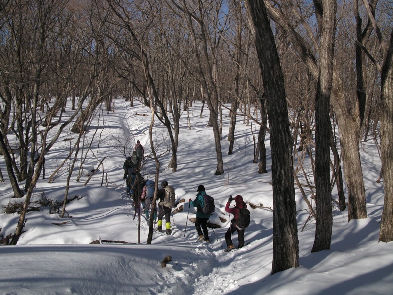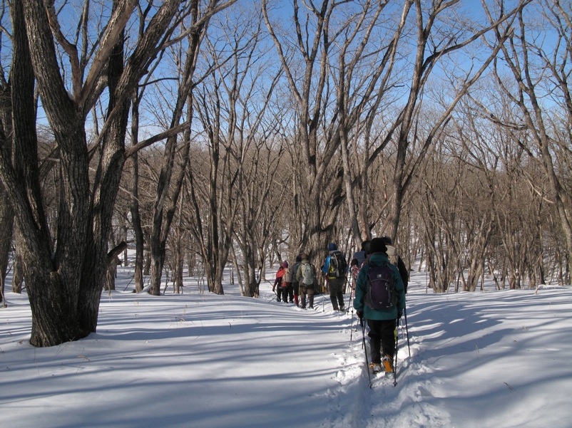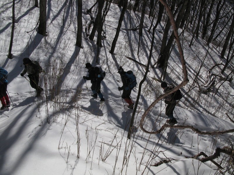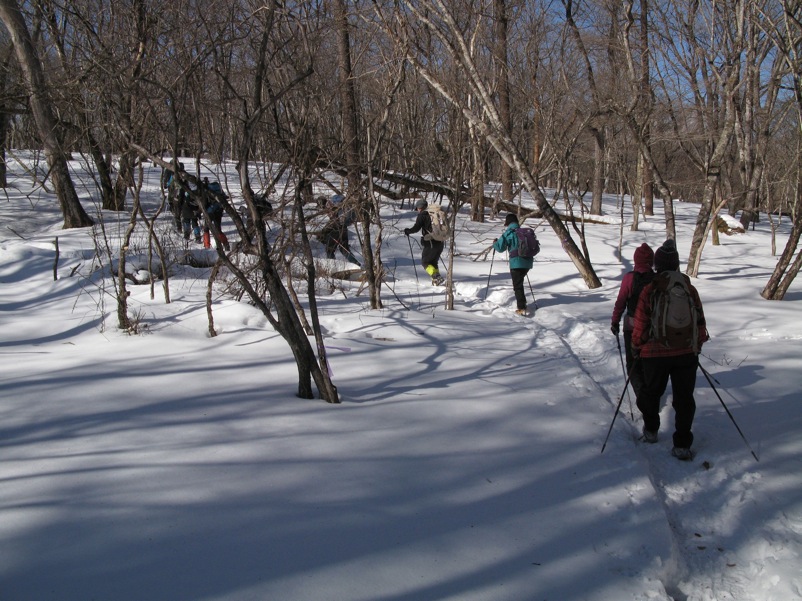 樹林帯に入ると、トレースがあるかないかで難易度がまったく違ってきます。なかったら、日没時刻を勘案しながら、別の道を探ることを第一に考えます。冬の山歩きの一番危険な状態です。でもここにはかなりしっかりしたトレースがあったので、トップ体験をいつものように10分交代にしてルートファインディングの体験をみなさんにしていただきました。