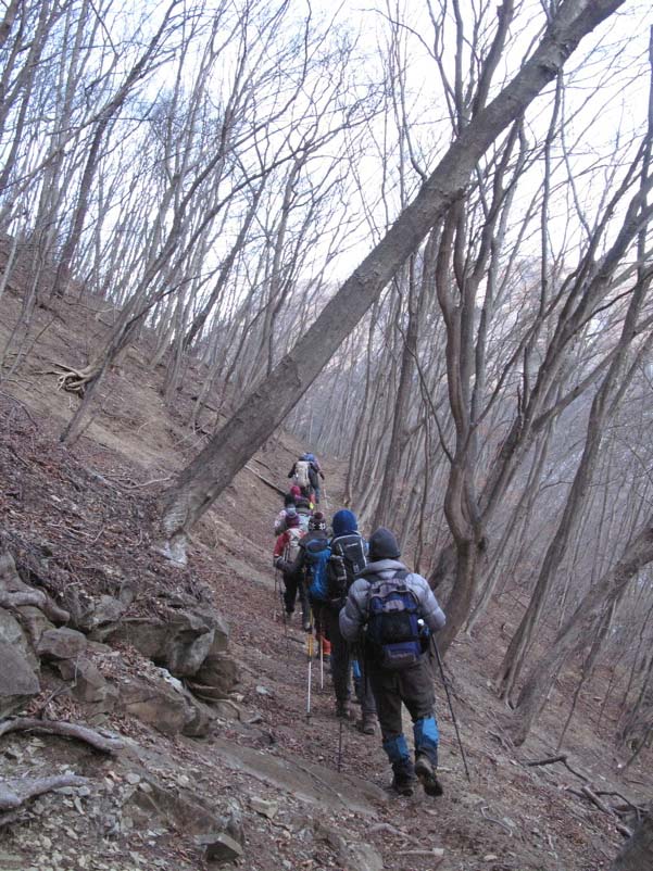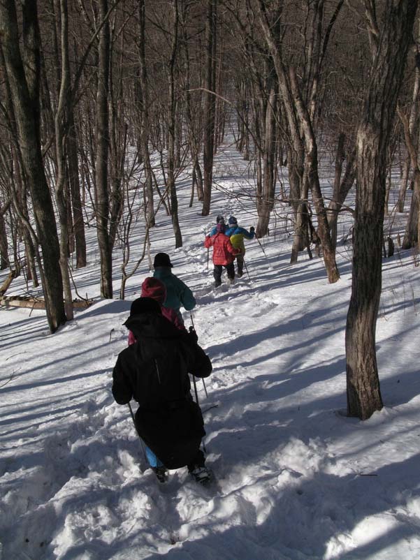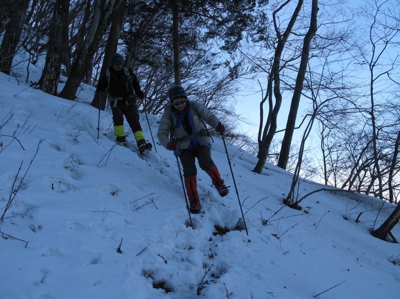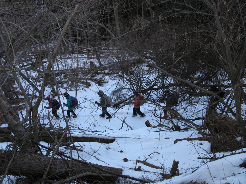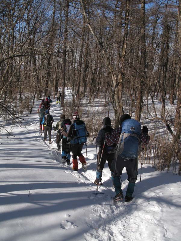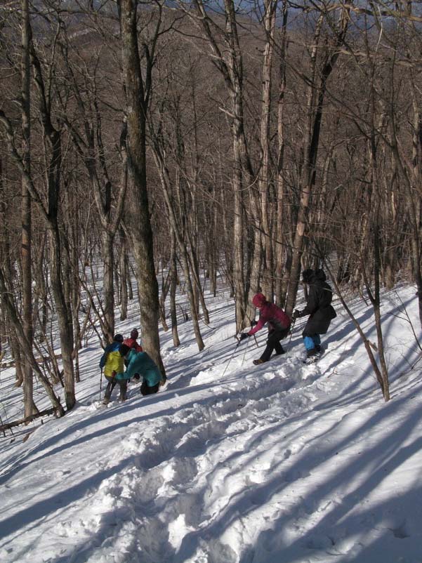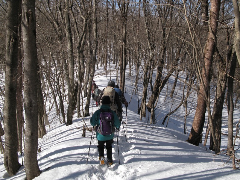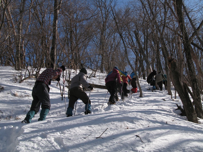 樹林帯に入ると、トレースがあるかないかで難易度がまったく違ってきます。なかったら、日没時刻を勘案しながら、別の道を探ることを第一に考えます。冬の山歩きの一番危険な状態です。でもここにはかなりしっかりしたトレースがあったので、トップ体験をいつものように10分交代にしてルートファインディングの体験をみなさんにしていただきました。