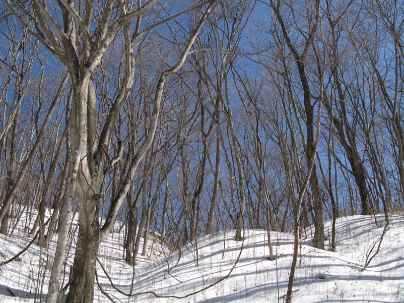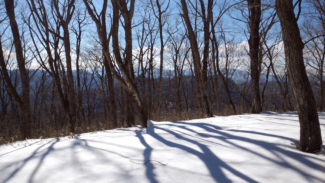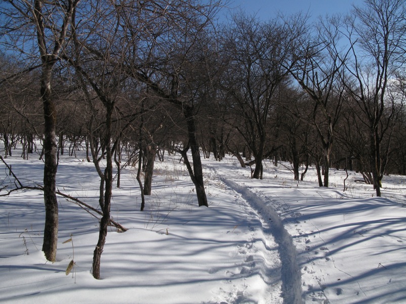 冬の低山の美しさです。この先に、一直線に足跡がのびていたので、キツネのようでした。