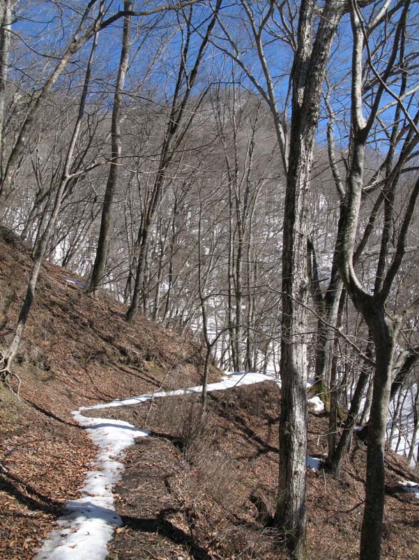 雪が消えると、トレースに関する不安はなくなります。積雪期の山から無雪期の山に抜け出たのと同じだからです。しかしアイゼンをどこで外すかについては悩みます。雪の吹きだまりは地形によって登場する可能性がまだあります。それと最後はおおかた谷筋の林道に出るのでしょうが、舗装路だとそこがツルツルに、危険な状態になっているケースがよくあります。(じつはこのときも最後は凍った道でした)