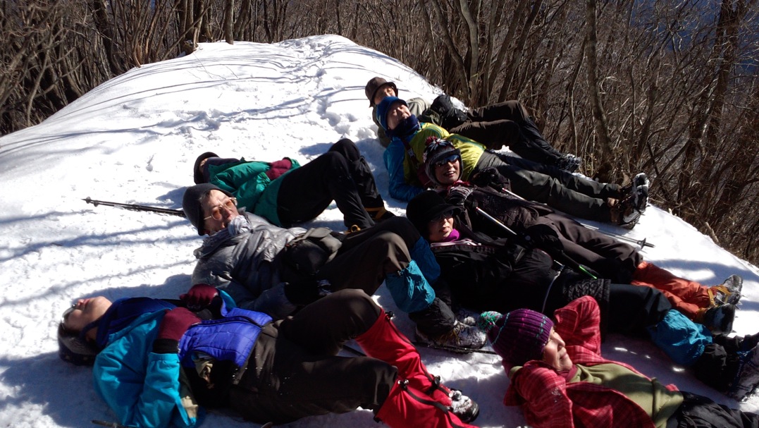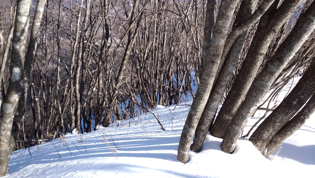 けっこうな急斜面で、楽しい下りになりました。事故の起きる危険のない雪の急斜面は、冬の山歩きの最高のプレゼントという気がします。そのために、いろいろな山を楽しみましたが、2月の八甲田山、3月の蔵王がベスト2。意外にいいのがピラタス蓼科スキー場の登山者用下山ルート。ここの下りの何倍も、楽しさが持続します。