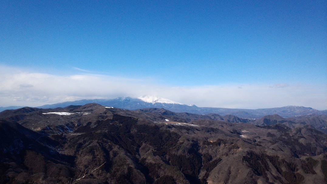 白い浅間山の下にちょこんと尖っているのが、たしか八風山(1,315m)。左に歩くとまろやかな盛り上がりが物見山(1,375m)、その麓の白い広がりは内山牧場で、右側には神津牧場が隠されています。神津牧場からこの足元の荒船の湯までは車の通る道ですが、歩くとそれなりに味があります。