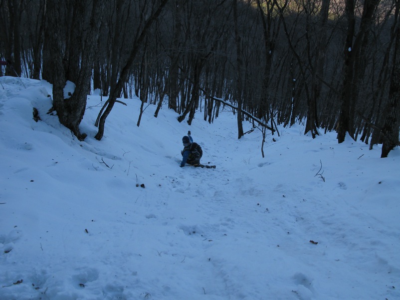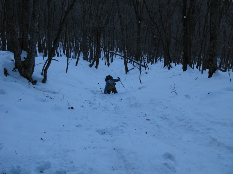 ほんのちょっと滑ったところで止まったのですが、踏まれていない新雪の斜面を登り直すとなると驚くほどエネルギーを消耗します。
