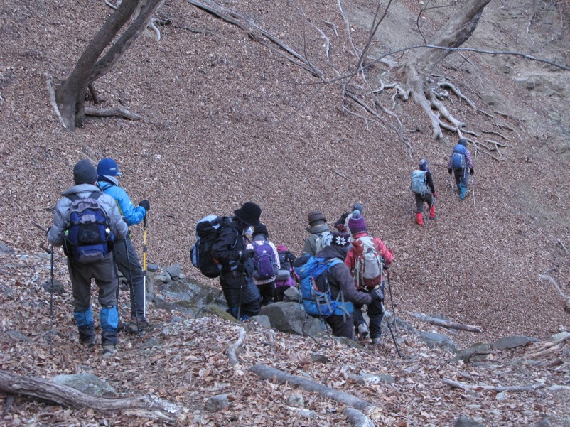 冬の山歩きは基本的に暖かいのです。鞍部や稜線に出るまでは、意外と風がないのが普通です。そして太平洋岸では晴れの日が多いので、太陽の暖かい光がそそいでいます。日だまりハイクの至福の瞬間といえます。