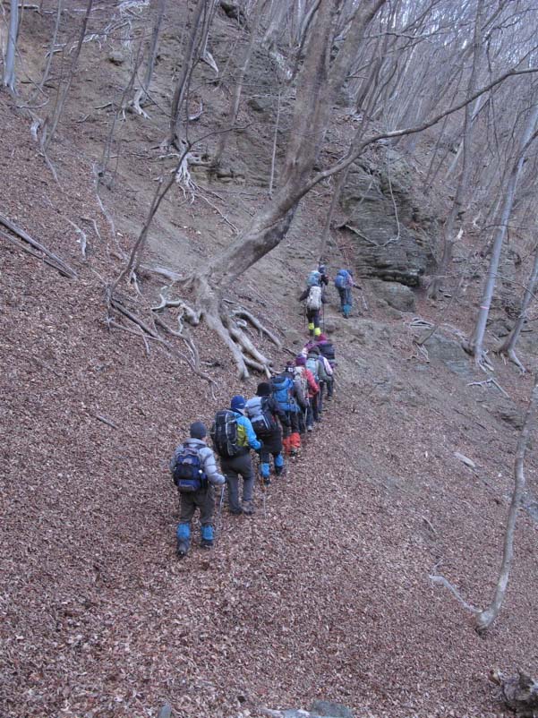 もうひとり、手すりの最後のところで下りに時間のかかった人がいました。片足できちんと立てるバランスが怪しくなると、とたんに無駄なエネルギーを要求されることになり、少しの不安感が、大きな危険を招き寄せるようになります。ダブルストックを有効に使うことで糸の会のみなさんは下りの技術レベルがかなり高いのですが、ストックに頼らずに歩くことも心がけて、自力でのバランス維持を心がけるようにしていただきたいと思います。とくに重心をかけた足の重心位置を動かさずに次の一歩を出せるように、重心移動のコントロールまで意識して下っていただきたい。そういう歩き方を体感するために、じつは「4本爪」の軽アイゼンが有効なのです。