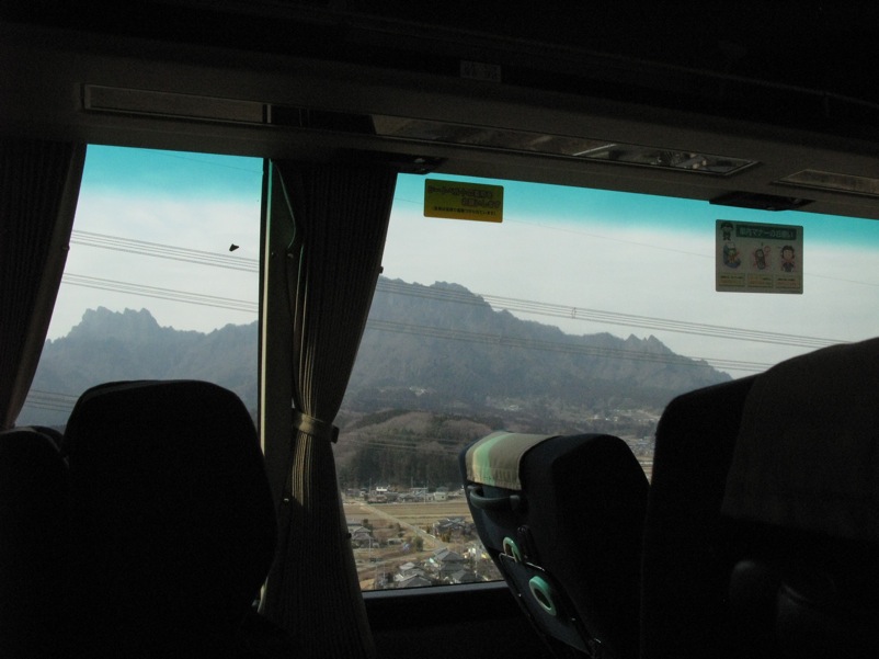 バスは関越自動車道の藤岡ジャンクションで上信越自動車道に入り、妙義山の脇をすり抜けて佐久高原へと向かいました。左手に妙義山という絶景がありました。