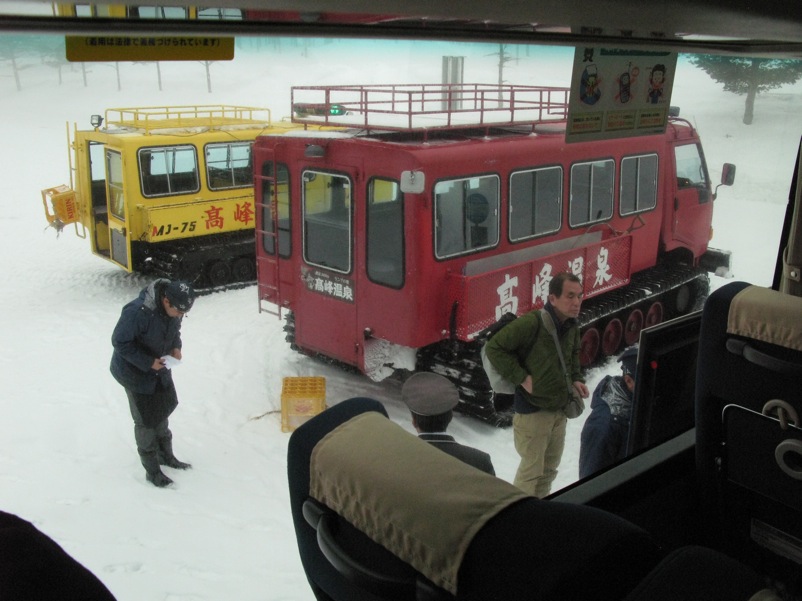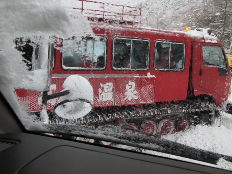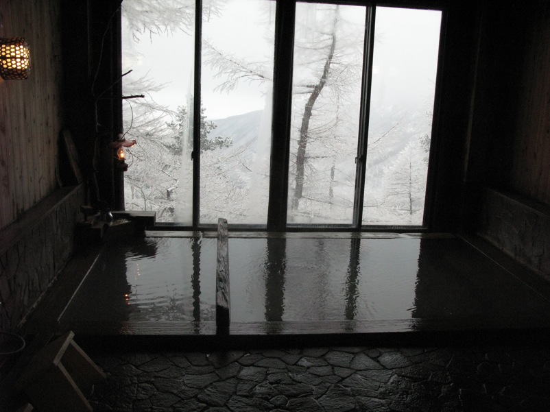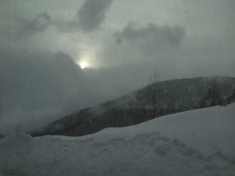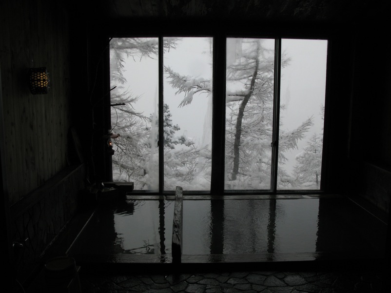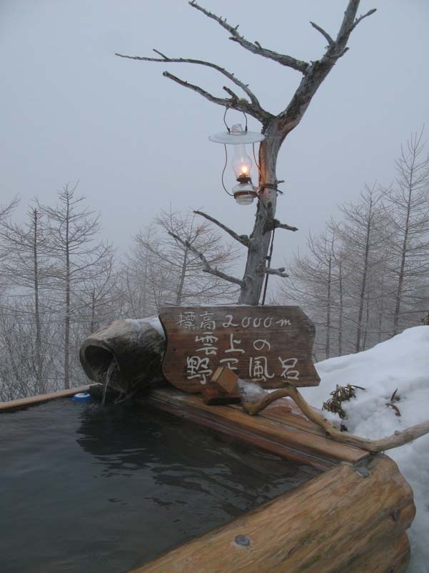 高峰温泉には野天風呂ができていました。入れるのはおおよそ午後から夕方5時まで、しかも天気によって閉鎖という状態で、これは午後5時に写真だけ撮りに行きました。雪のトンネル気分の道をちょっと歩くと、天涯孤独みたいな気分の定員4人の風呂が男女別にありました。Kさんはこの後滑り込みセーフとなりましたが、「明日に期待」のそのほかのメンバーは悪天候のために入れませんでした。