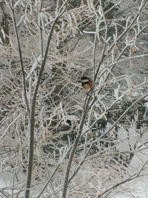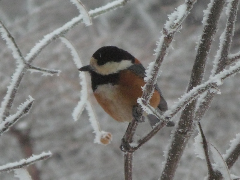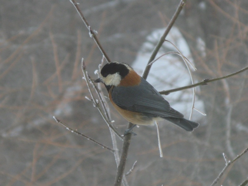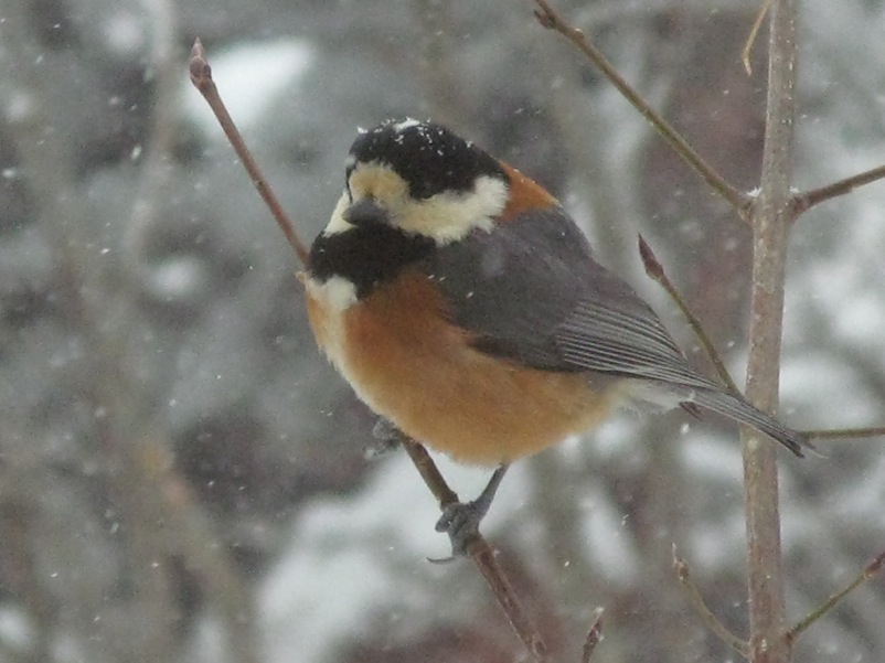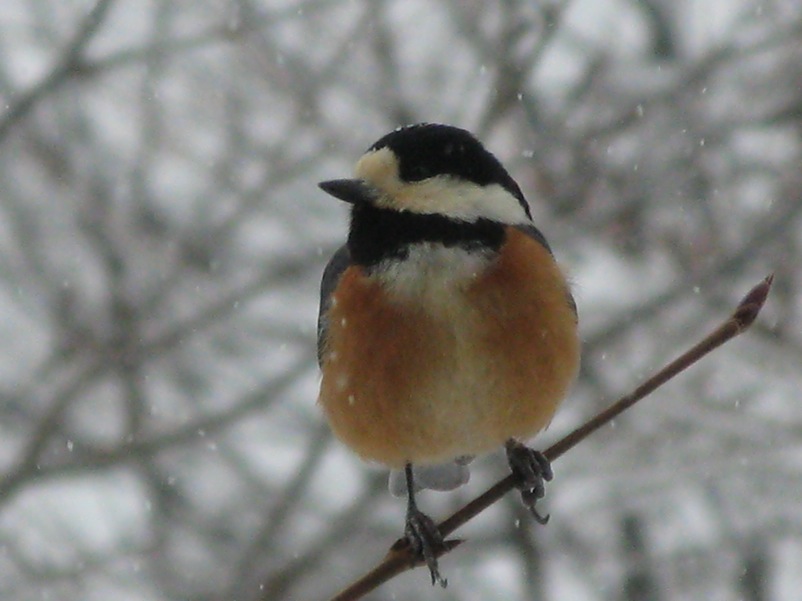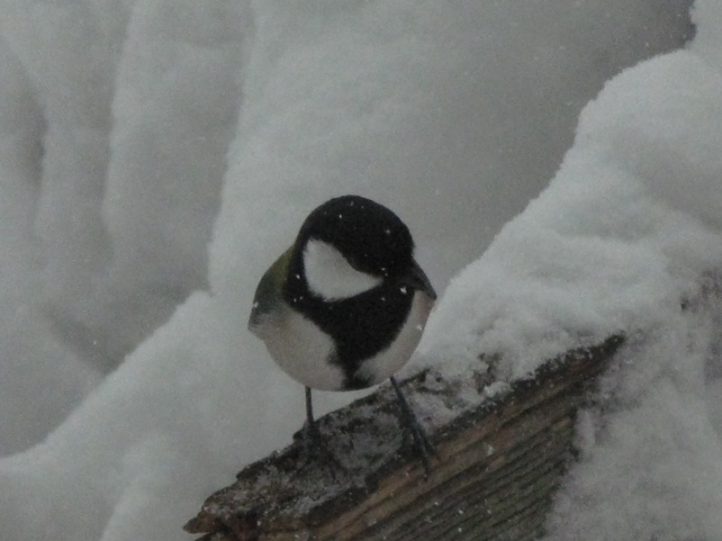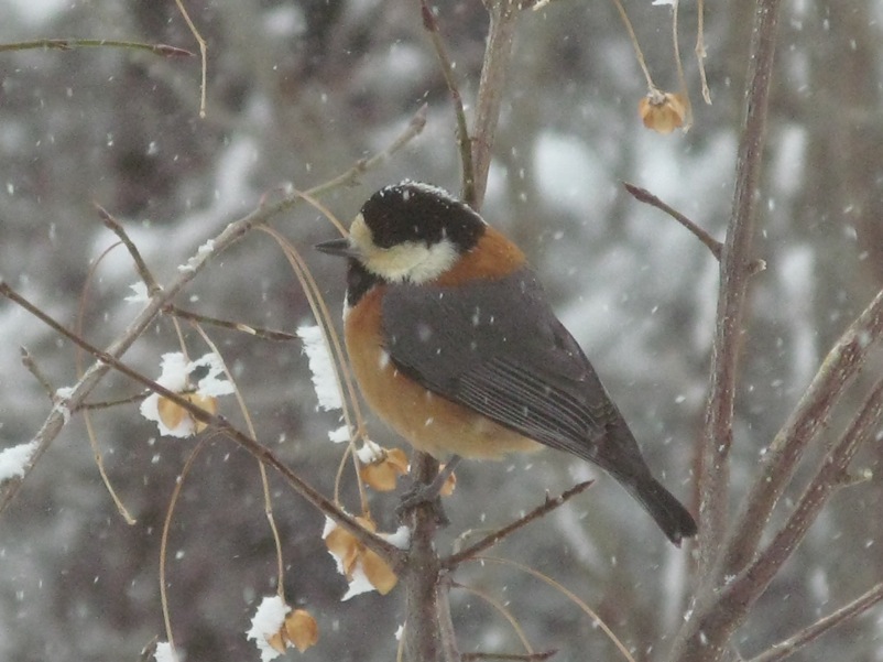 ヤマガラのポートレイト写真。目がきちんと見えないと野鳥の写真としては失格でしょうが、胸のふくらみがガラス越しに見ているとはいえ、雪の中でほっこりとしたいい気分に見えています。