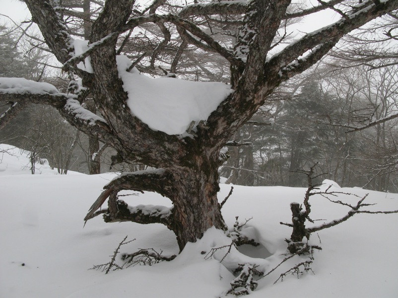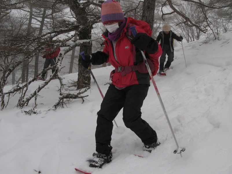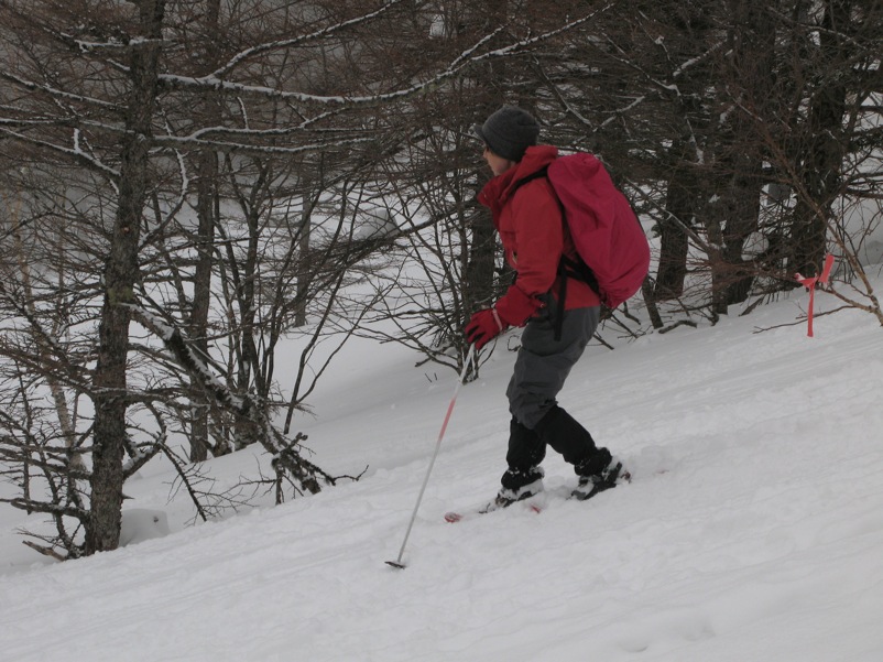 登山者がいるのはトーミの頭。じつはそこまでの登りの部分が裸の急斜面になっていて危険地帯。登りは緊張しただけですが、下りでは滑落の危険がなしとはいえません。クサリがついてはいるのですが、ほとんど雪に埋まっていて、事故対策にはなりません。私は登るときからその危険部分は林の中を突破すると決めていました。幸いここに見えるツアーグループはここで引き返すとしてやはり林内に踏み込んだので、その後を追わせてもらいました。