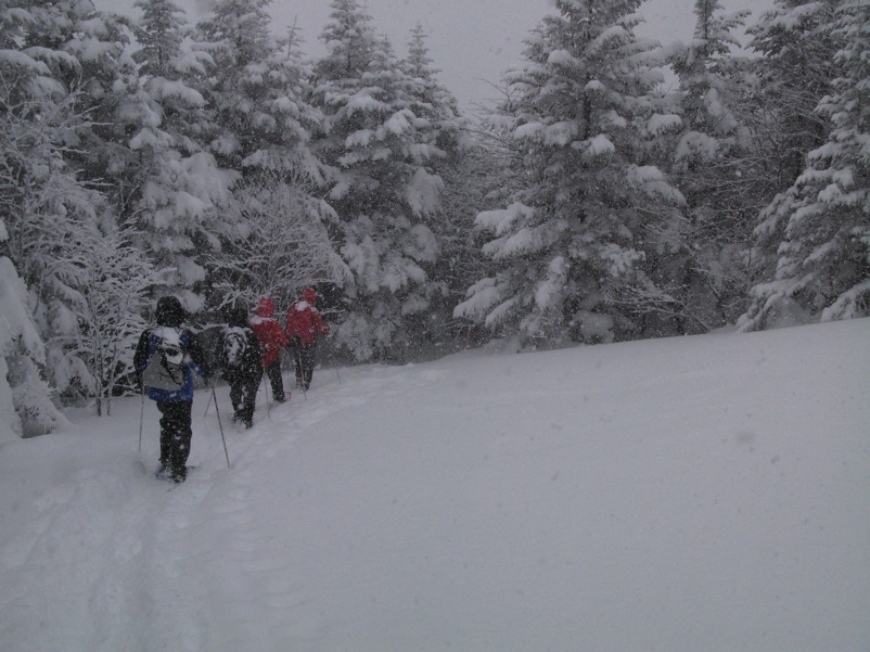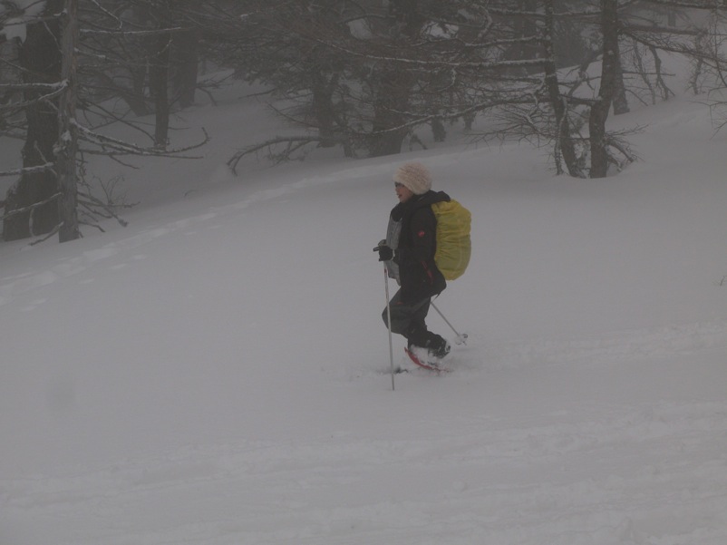 下り斜面で「走る」というのも道具にからだを慣らすのに貴重な下準備です。今回借りられたのはMSRの新型機種で、10年ほど前に多くの皆さんに買っていただいたスノーシューと(たぶん)同じ本体。画期的なゴムの締め具がすでにみな交換不可能な状態になっていて使用を諦めていたのですが、こんなのが登場したら締め具部分を交換できるのではないかと、今回の5人中3人が思ったのでした。