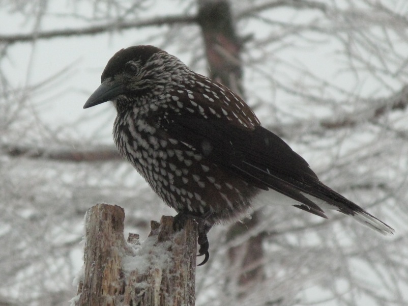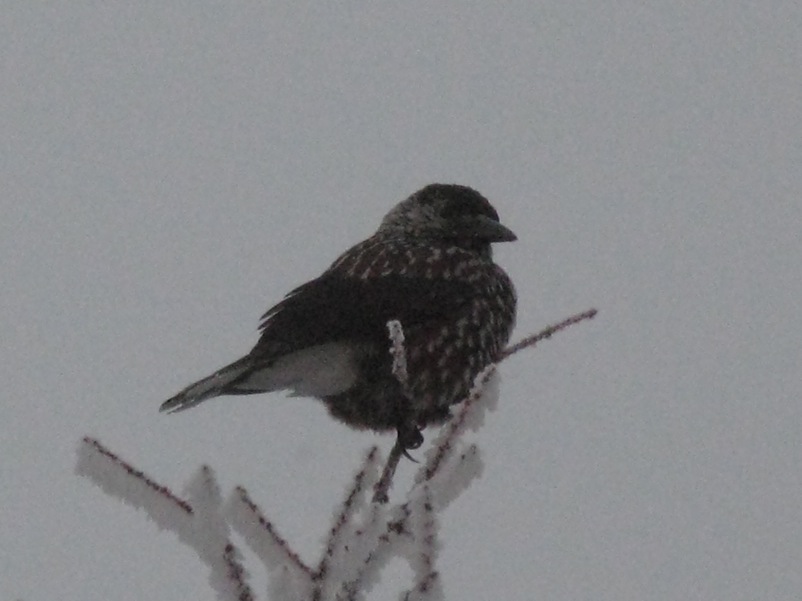 これはヤマガラでしょうか。ホシガラスの集団をエサ場の周りで偵察中。