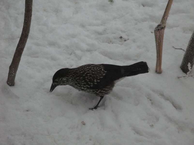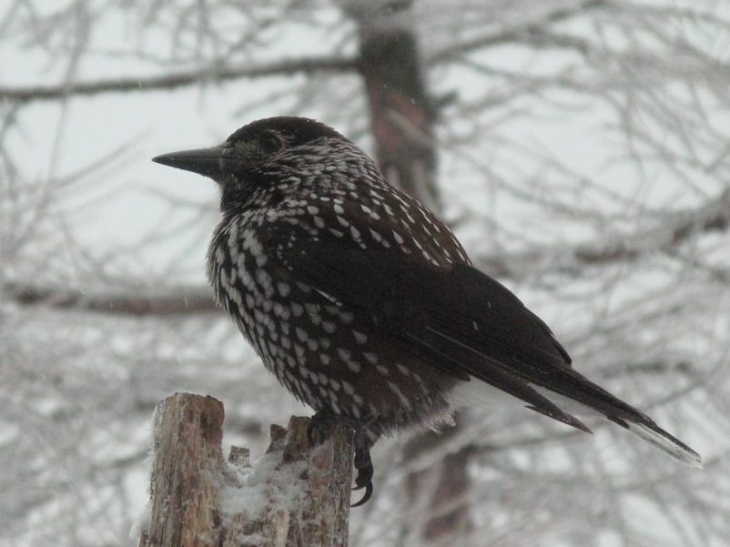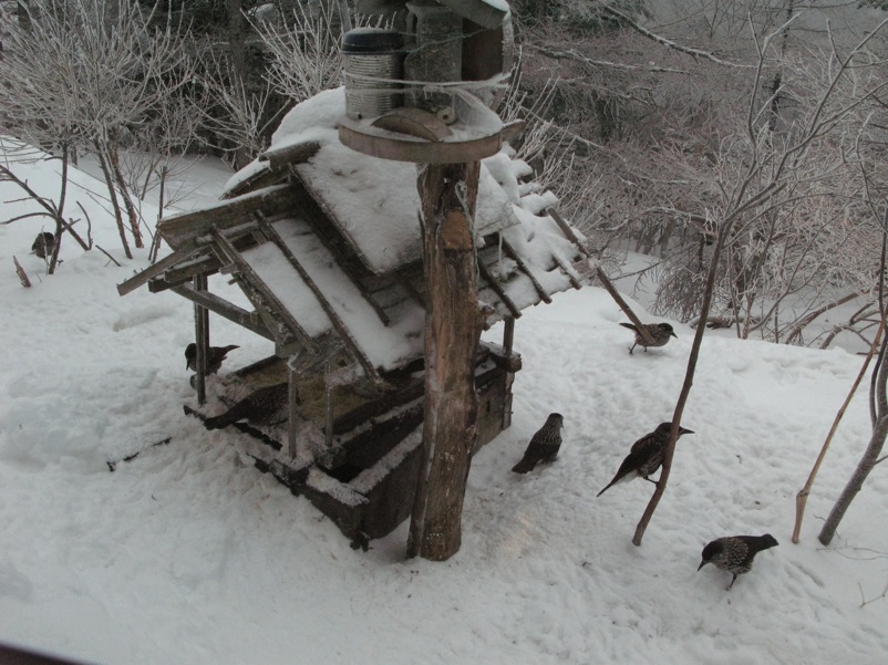 朝、というより宿の人の解説では午前中は、餌台はほとんどホシガラスが独占状態とか。夏にはほとんど近寄らないというホシガラスが10羽以上、食べ放題、遊び放題の天国状態が続きます。