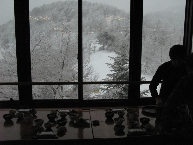 最終の路線バス(佐久平駅から高速バスに変身)に乗る人たちが送迎雪上車が2台分という人気の宿。真冬に標高2,000mの山上の温泉宿としては美ヶ原の王ヶ頭ホテルとこの高峰温泉が長野県の冬の両巨頭と思うけれど、山小屋から始まった王ヶ頭ホテルはいまや外国人旅行者にも人気の観光ホテルとなって以前のようなバーゲン企画はすでに皆無。部屋割りなども融通が利かなくなってきました。ランプの一軒宿から始まったこの高峰温泉ものんびり構えていたら安い部屋は満室とのこと。(それほどの満室ではなかったと思うけれど)全室トイレ付きとして春から値上がりするといいます。料理は完全都会派レストランの王ヶ頭ホテルに対してこちらは地産地消型ローカルメニューかな。