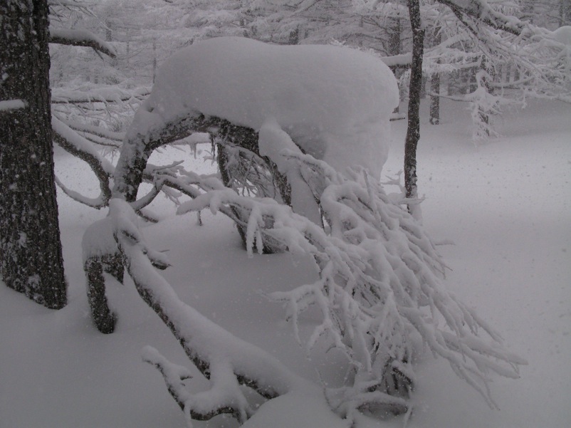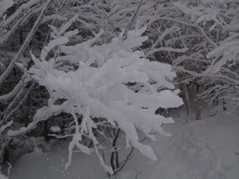 こういうことは自分のカメラときちんと付き合うためには重要な体験で【25】では感じなかった「適正露出」がここではちょっとオーバーに出てしまったと考えます。前の【33】だと適正の範囲内にあるので、このカメラにとって「ちょっと苦手」な状況かもしれません。ただ一般的に、デジタルカメラの多くは、私にはいくぶん「明るめ」にセットされているように思われます。こういう場合には全ての撮影を「マイナス1/3絞り」に指定してみることをすすめます。もっとも【35】以下の私の写真では雪がもう少し明るく写っていた方いいという写真が多いようです。現地でそのへんの判断をしようとすると難しくなります。