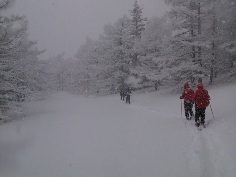 結局、1日目は高峰山の方面に登り30分、下り30分の足馴らし+腹ごなしをし、2日目は黒斑山往復とすることに決めました。じつは今年は昨年並みの大雪で、水ノ塔山〜籠ノ登山の斜面からの雪崩が林道を埋めて、周回の戻りに予定していたこの部分がスキーヤーや登山者に対して通行禁止になっていたのです。そこで黒斑山往復を考えていたところ、宿ではそういう登山者に送迎雪上車を出すとのこと。スキー場から黒斑山往復の「中コース」がスノーシュー用に整備されているというのです。私たちは09時に宿出発、14時30に宿帰着という枠組みのなかで出発したのです。
