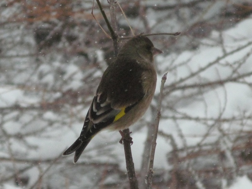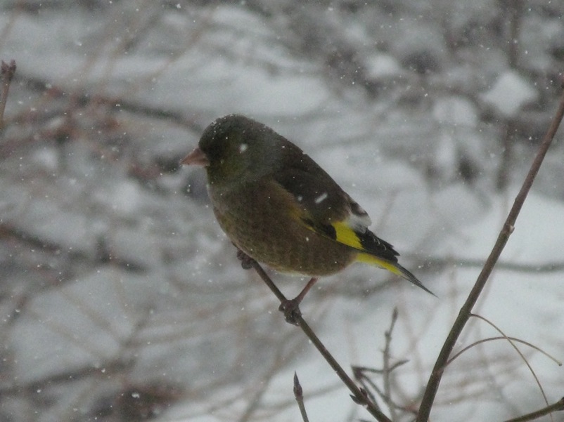 カワラヒワの表情がかなりこまかく写りました。穏やかな表情。黄色がじつにいいセンスで散りばめられています。カメラはシャッターボタンを押してからいつ写真を撮ってくれるのかわからないうえに、ズームレンズを超望遠にすると対象を画面真ん中に維持するだけで必死。こんなフレーミングになったのは、そういう意味では失敗ですが、雪が背景以上の役割を果たしてくれて、まるで意図して撮ったみたいにうまくいきました。