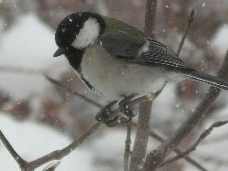 シジュウカラの顔を見ると、黒いひげというよりも白い頬というふうに見えます。黒は胸まで伸びてネクタイなんだそうです。それにしても肩の辺りから背中にかけての色合いはこの写真がうまくとらえていると思います。