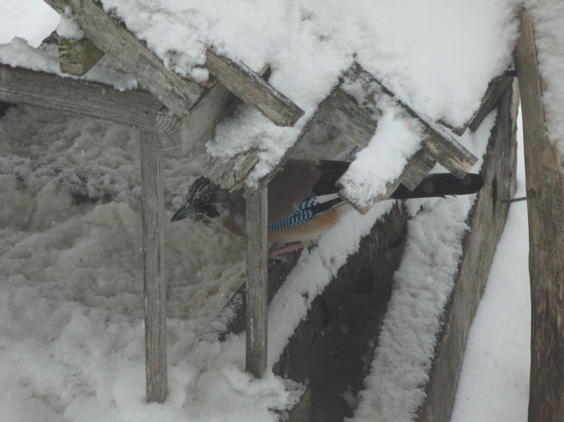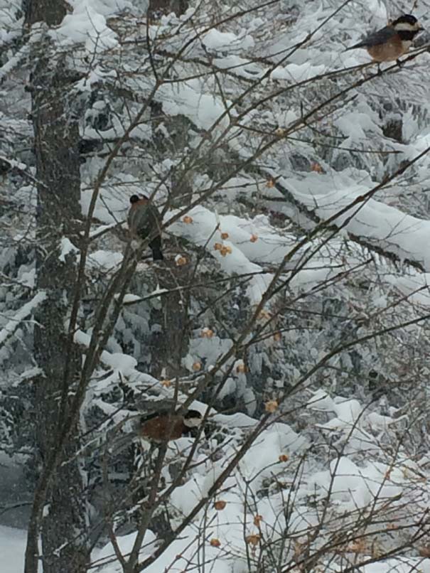 【25】で三浦さんが見つけたように、ヤマガラが餌台の状態を遠くから偵察していますが、とても入れる状態ではありません。