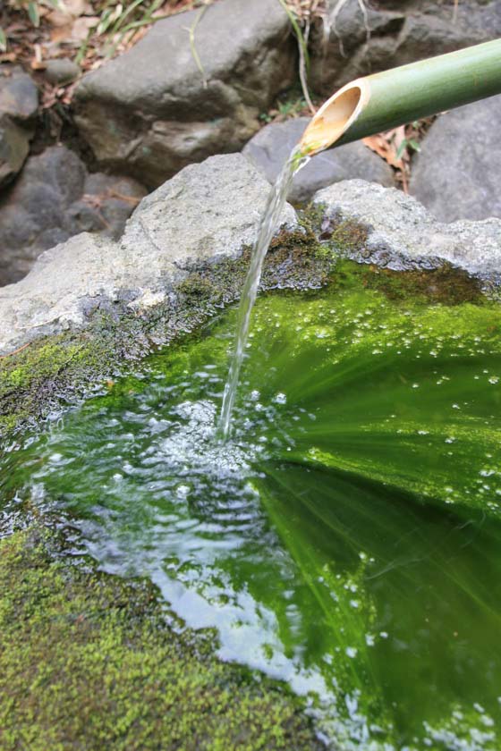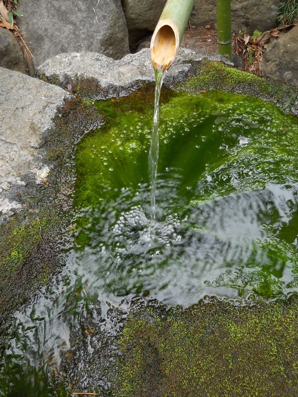【07】東屋の中から撮ると鎖樋が楽しいですが、ドーナツ状の池はよく見えません。
