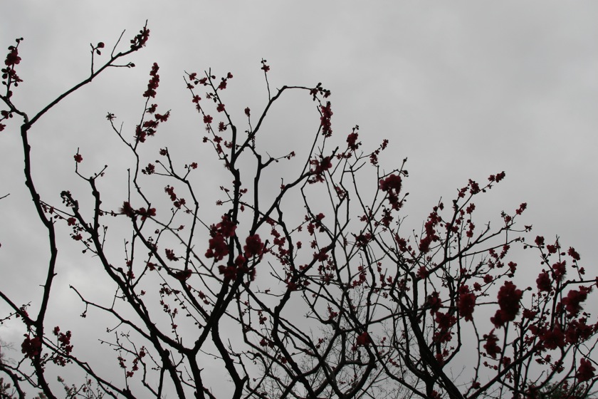 【43】曇り空の中に赤い梅。寒い空気に色を差して、すぐそこまで来た春を予感させる。わずかな色でも。わずかな花でも。