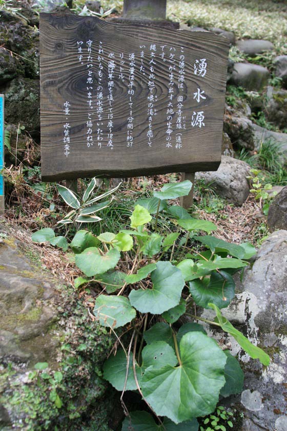 【56】園内で湧き出ている湧水源。立て札の説明書きにあるように、この湧き水の水温は、年間通して15度〜18度。この日は、連日の小春日和とはうって変わって寒い一日。この湧き水が温かく感じられ、凍えたからだに、少しの元気と喜びがわいた。