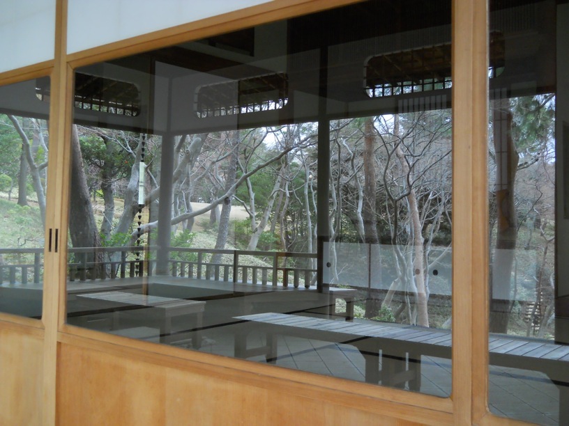 どうなっているのかというと、紅葉亭のベランダ部分から座敷の方を見ています。座敷のガラス戸に背後の風景が写っていました。