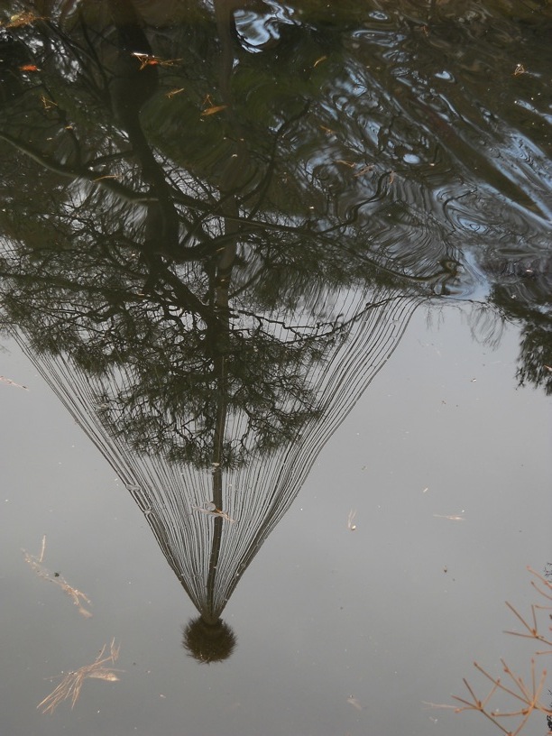 次郎弁天の岸辺に雪吊りをほどこしたマツの木がありました。この日は風がなかったので水面は穏やかでしたが、私が岸辺に立った(ためかどうか明らかではありませんが)、大きな鯉がゆっくりと近づいてきました。波紋はその鯉が立てたものです。